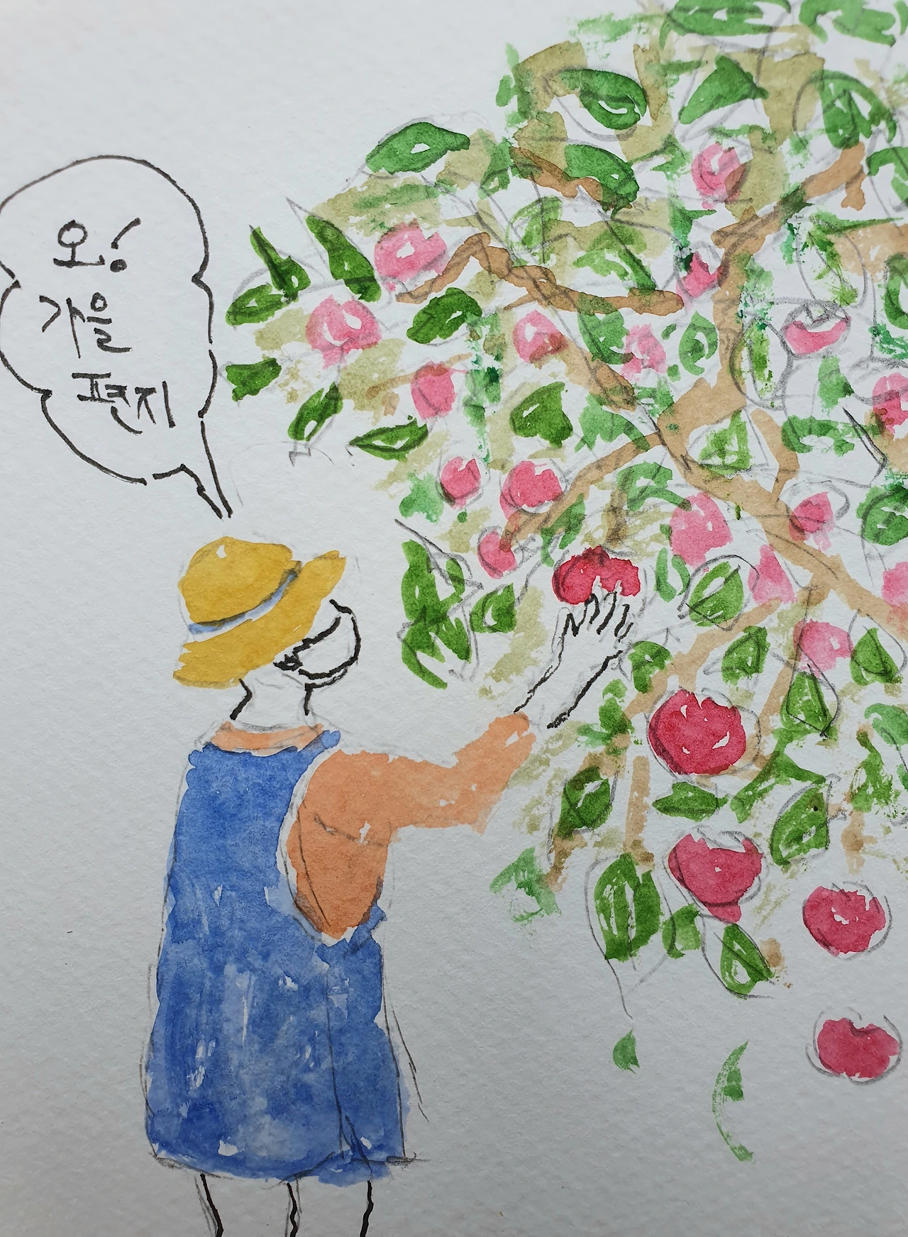 아침 밥을 짓기 전 어스름, 늦잠꾸러기 남편을 내버려둔채 골짜기 산길로 나선다. 대구 사과 원산지 평광동답게 사과밭이 길 양쪽에 끝없이 이어진다. 손을 내밀어 사과나무 가지와 악수를 한다.
