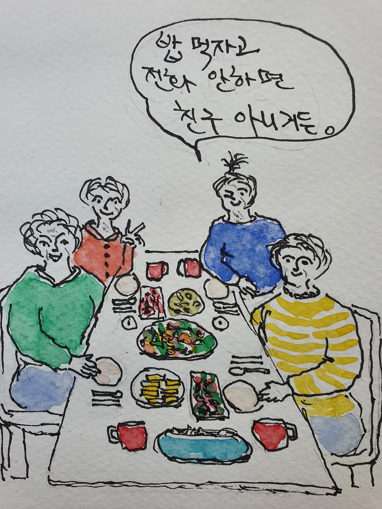메뉴는 부추전이랑 미나리 넣은 도토리묵무침에 무알콜 맥주. 행여 모자랄까 싶어 두부 부침을 추가한다. 한 친구가 홈메이드 고등어조림을 가져왔다. 배추된장국을 차려내니 후다닥 세팅 완료!