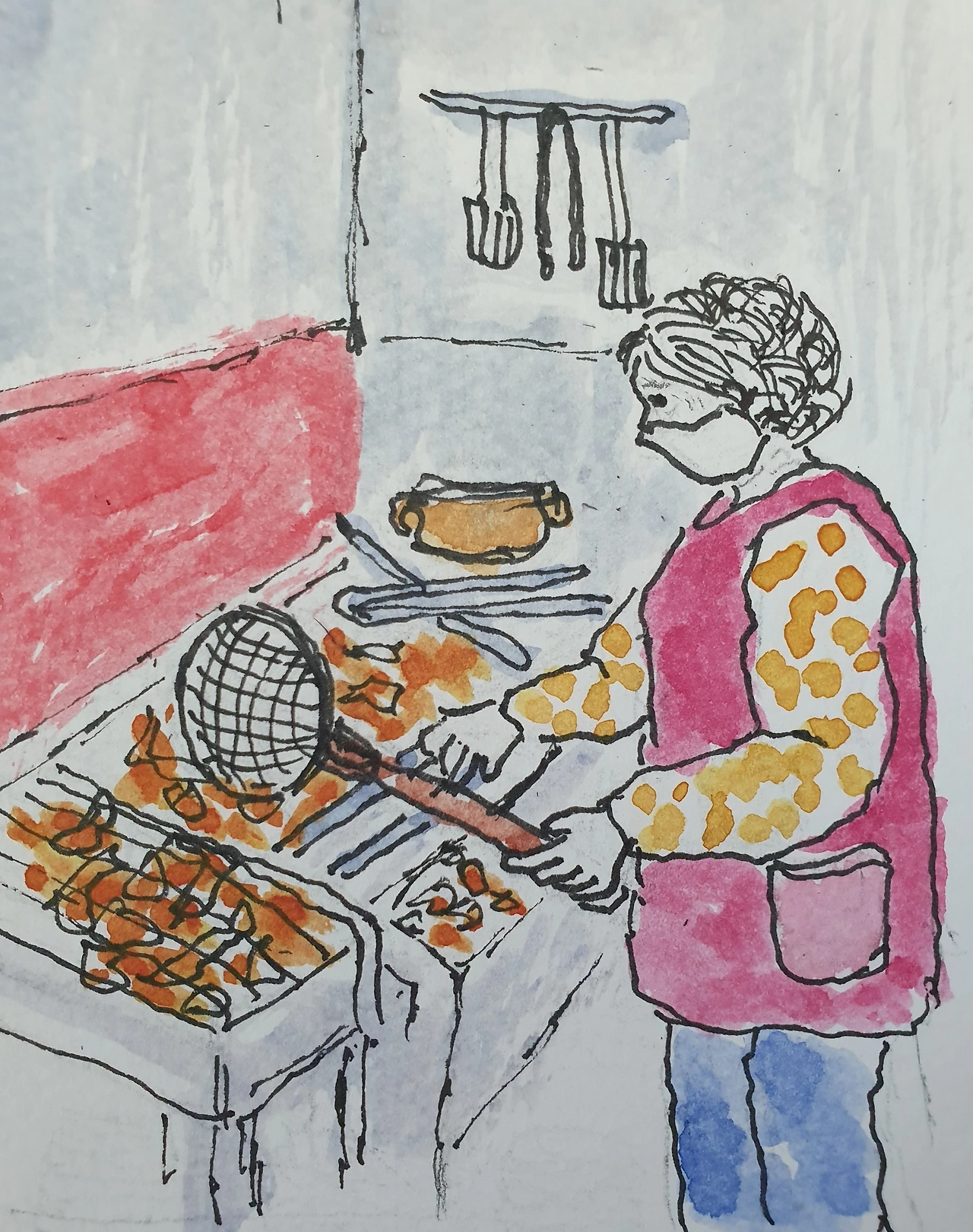 동네 치킨집에 전화로 프라이드 윙을 주문한다. 배달비를 절약하기 위해 언제나처럼 20분 뒤 픽업하러 간다. 여사장님이 유난히 반가워한다.