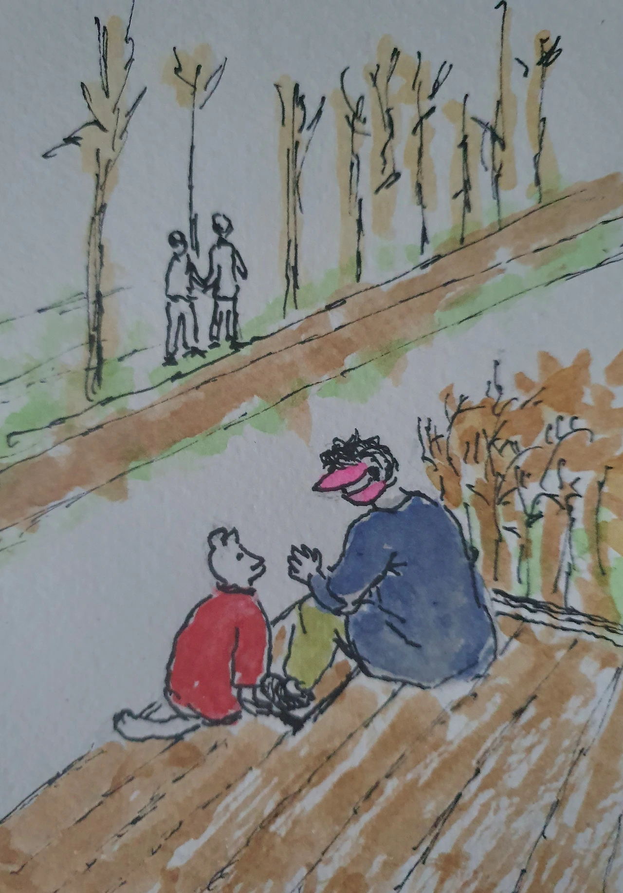 갈 데가 없다. 양재천 길을 걷는다. 요 며칠 봄볕에 하루가 다르게 둑길이 초록초록해지고 있다. 징검다리 옆 데크에 마주앉은 중년 여성과 친구, 뭔가를 나눠 먹는다. 의젓한 자세로 그녀의 곁을 지키는 빨강이가 믿음직스럽다. 계단식 데크 덕분에 눈높이를 서로 딱 맞춰 마주앉은 위치 덕분일까. 엄청 평등해 보이는 교감 분위기다.