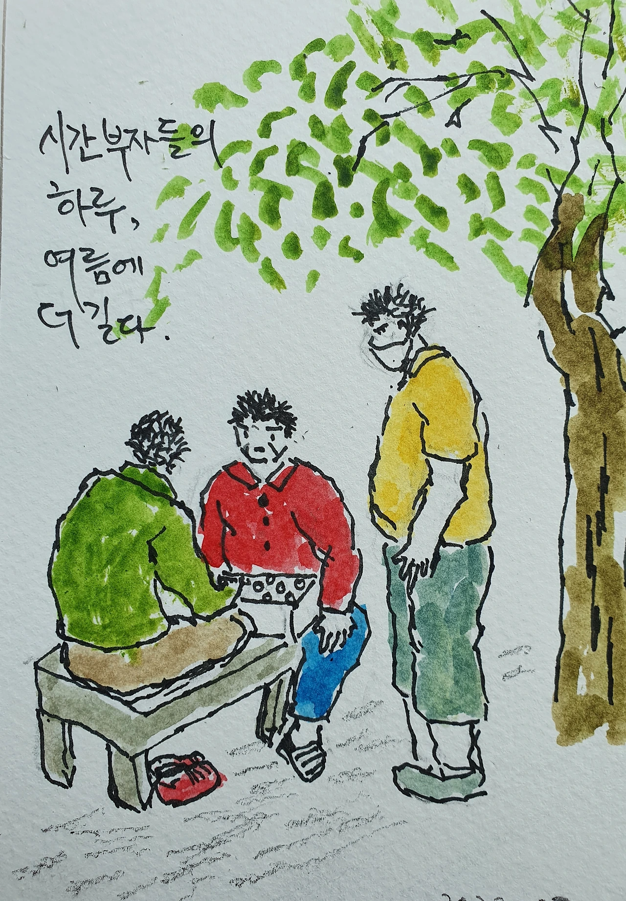 분위기를 돌리자며 한 친구가 최애 트롯 가수 영탁씨가 부른 노래 ‘꼰대 라떼’를 소개한다. 이 땅의 나이든 세대가 지닌 권위주의적 행태 덕분에 ‘kkondae’가 영국 브리태니커 백과사전에 등재된 기념으로 발표한 노래 같다나. 다들 웃음을 참지 못한다. 한편, 다양한 정보와 세상 흐름에서 소외되기 쉬운 노인들의 특성 상 시야협착증을 스스로 경계하자는 그 친구의 말. 다들 고개를 끄덕인다.