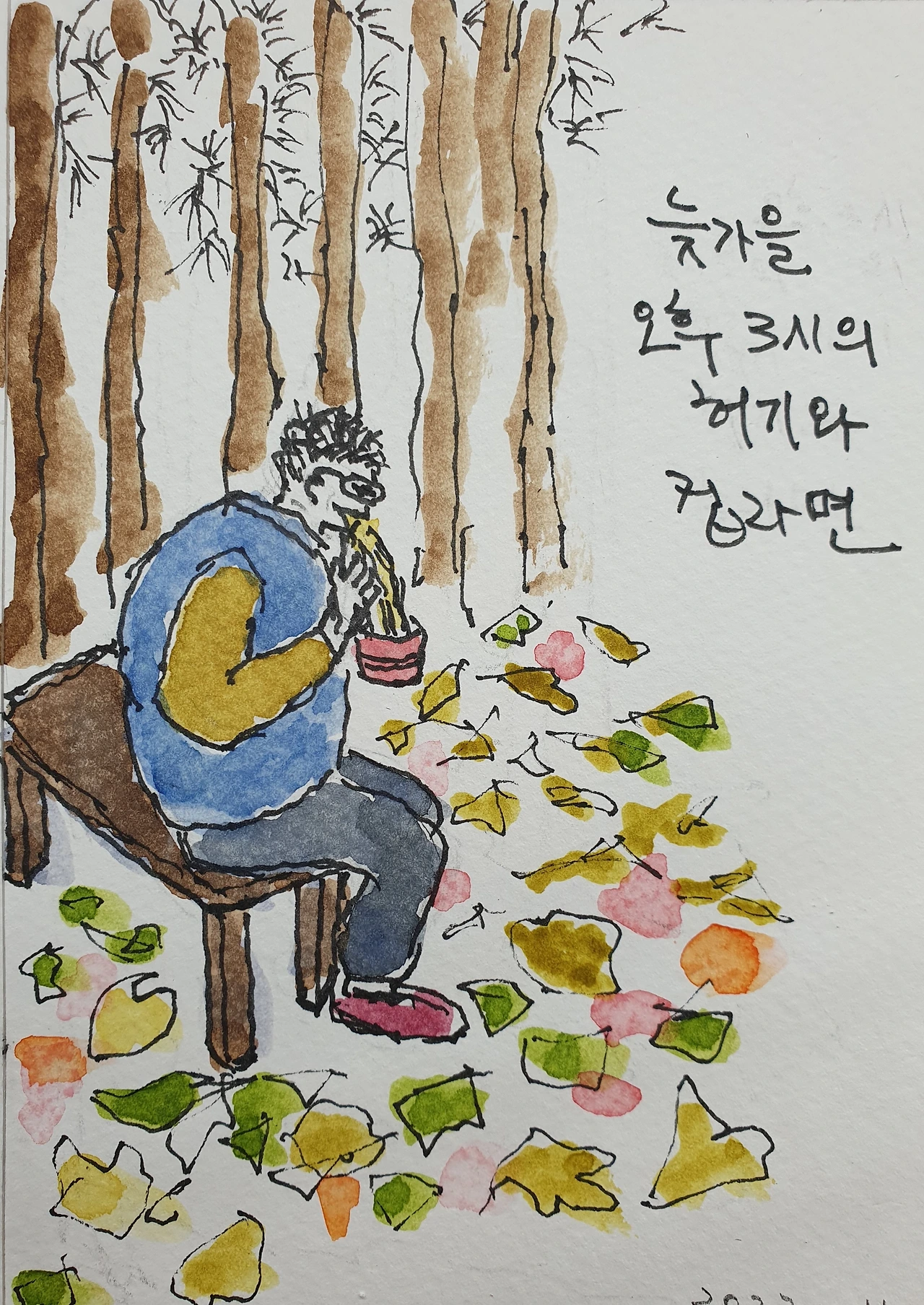 “마누라 답장이, 그냥 라면 좀 끓여 먹으면 안 되냐는 거예요. 그리곤 날마다 나를 세끼 멕여 살리느라 힘이 너무 들고 그 스트레스 때문에 친구들이랑 외식하는 거라나요.” 다른 두 남자들이 허~~, 애매하게 웃는다.