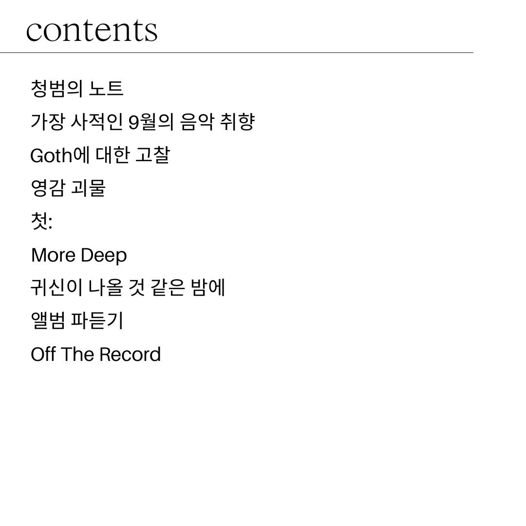 안녕하세요. 청포도 레코드라는 잡지를 운영하고 있는 청범이라고 합니다. 청포도 레코드는 저의 사이드 프로젝트로 시작한 인스타 매거진입니다. 이번이 첫 창간호입니다. 그래서 조금 헛점이 많아 있습니다. 이 잡지를 시작하는 두 가지 이유가 있습니다. 글 실력을 늘리고 싶다. 그리고 좋은 무명 아티스트, 좋은 숨겨진 곡을 모두에게 알리고 싶다. 기존의 매거진과 다른 점은 매달 잡지를 관통하는 주제가 있습니다. 하나의 차이점을 주고 싶었어요. 그래서 고민도 많이 했습니다. 통일성을 주려고 노력했고요. 배치와 디자인에도 신경을 썼습니다.