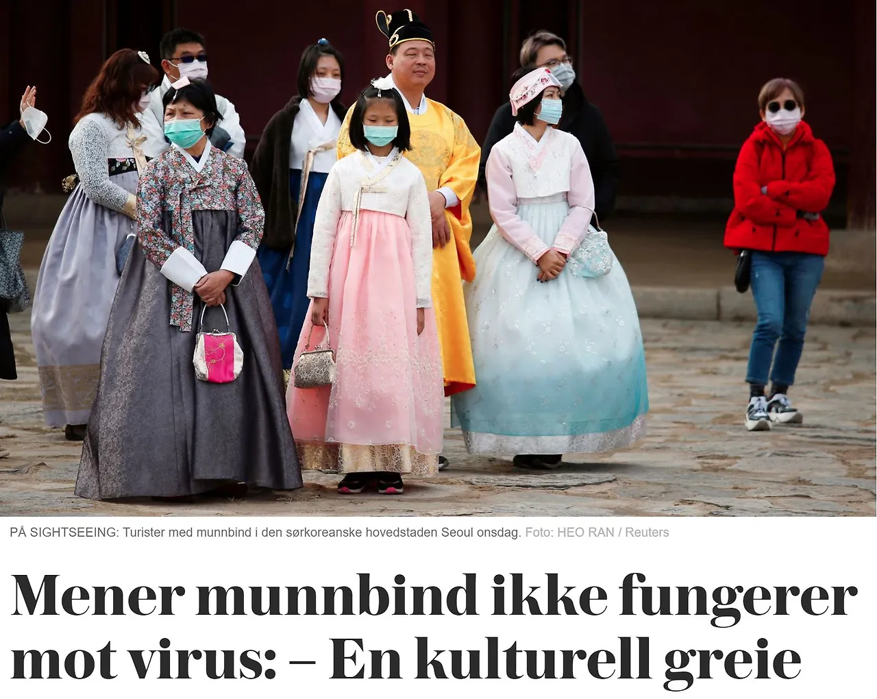인플루엔자 같은 바이러스가 유행할 때 아시아에서는 마스크를 흔히들 사용하는 데 이는 문화적 특징 같은 것이다. 그러나 마스크를 쓴다고 해서 예방이 되거나 하는 것은 아니다. (출처 vg.no)
