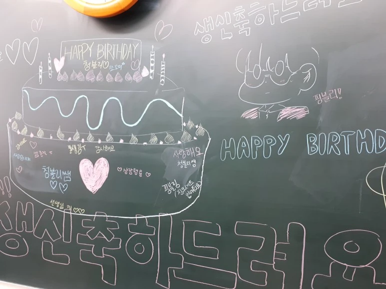 학교에 소문이 다 나서, 선생님들의 릴레이 축하를 받고, 오늘 중간고사 끝나고 종례하기 전 반 아이들이 칠판에 이렇게 케이크도 그려주며 축하를 해주었다.