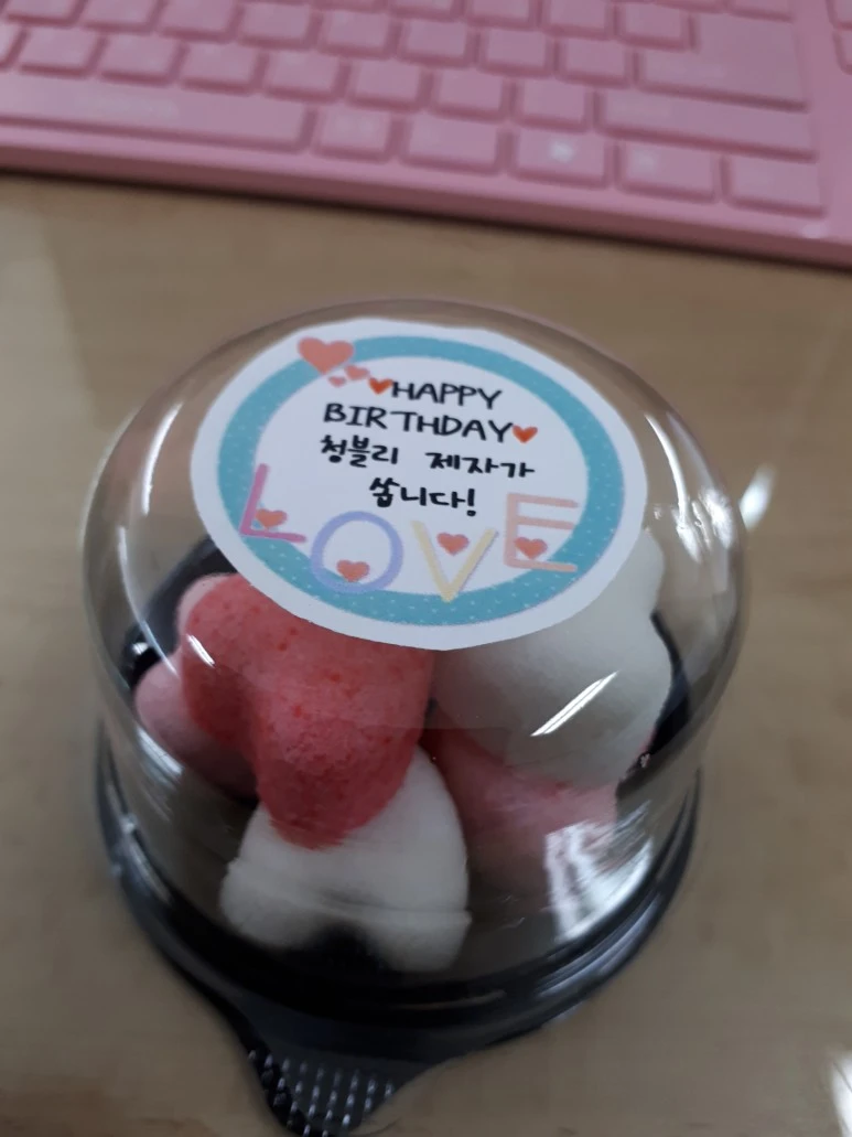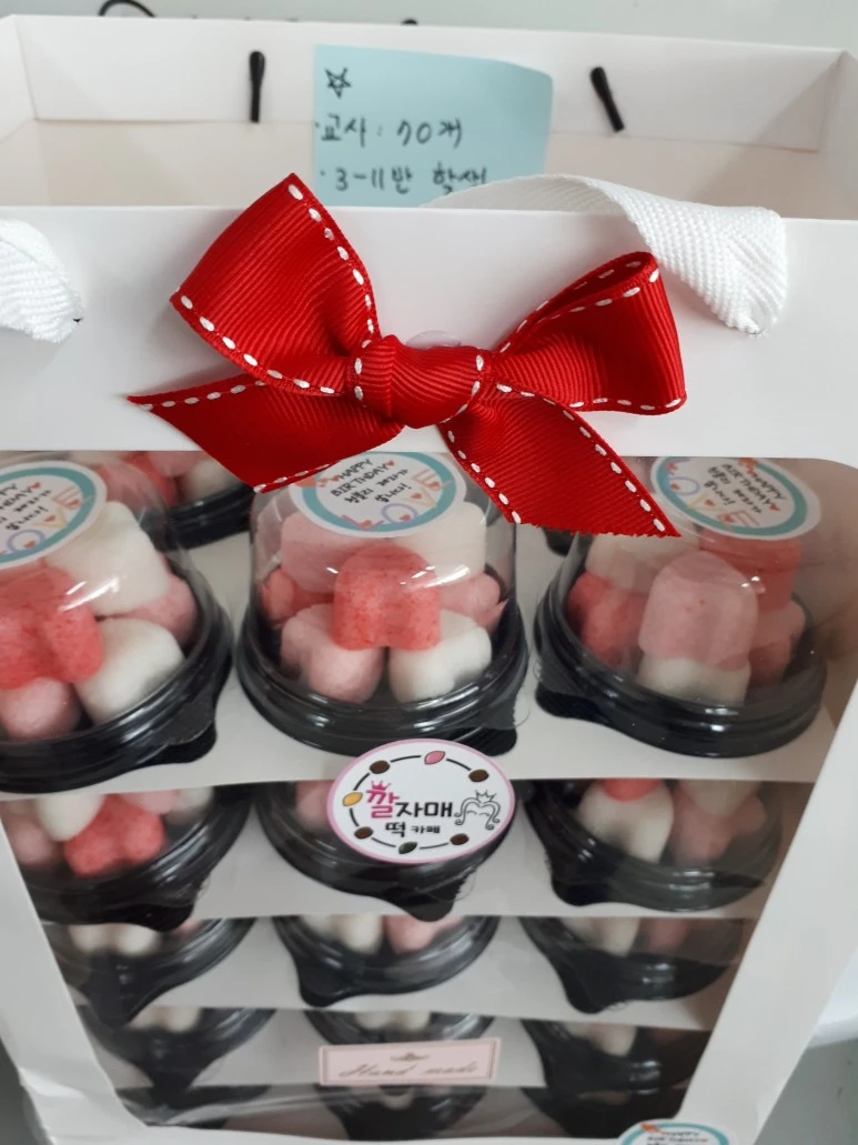사랑스러운 하트 모양의 개별 포장 떡 위에 “Happy Birthday 청블리 제자가 쏩니다”라는 스티커가 붙어 있었다.