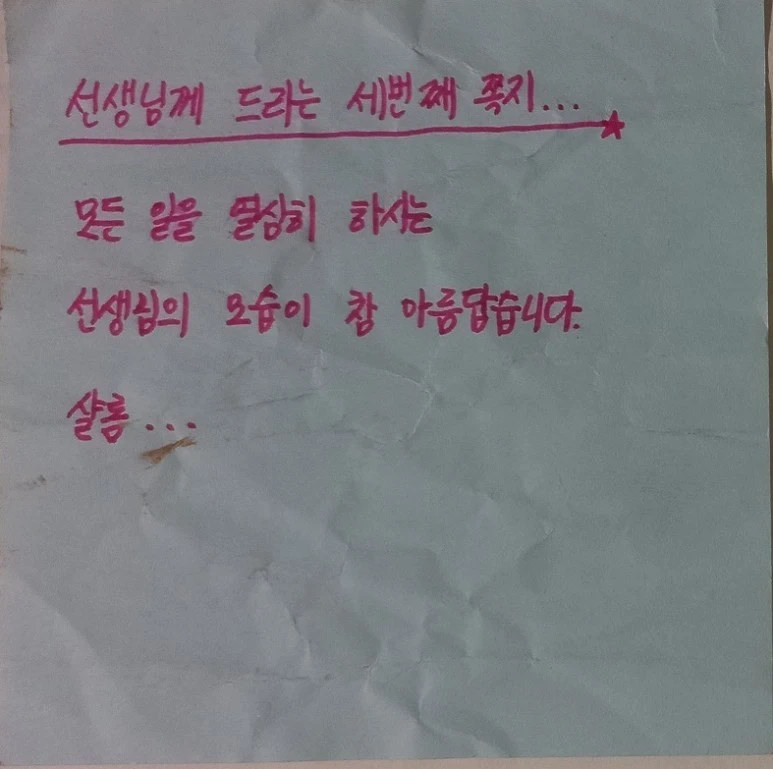 부끄럽지만 난 이 학생을 찾아야겠다는 마음으로 국어선생님의 도움을 받아 전교생의 중간고사 주관식 답란을 보며 필적을 대조해 보기도 했다. 이거다 하면서 일치하는 학생은 없었지만, 비슷해 보이는 필체가 있어서 확신도 없으면서 엉뚱한 학생들 앞에서 자꾸 의식하게되는 민망했던 기억도 난다.
