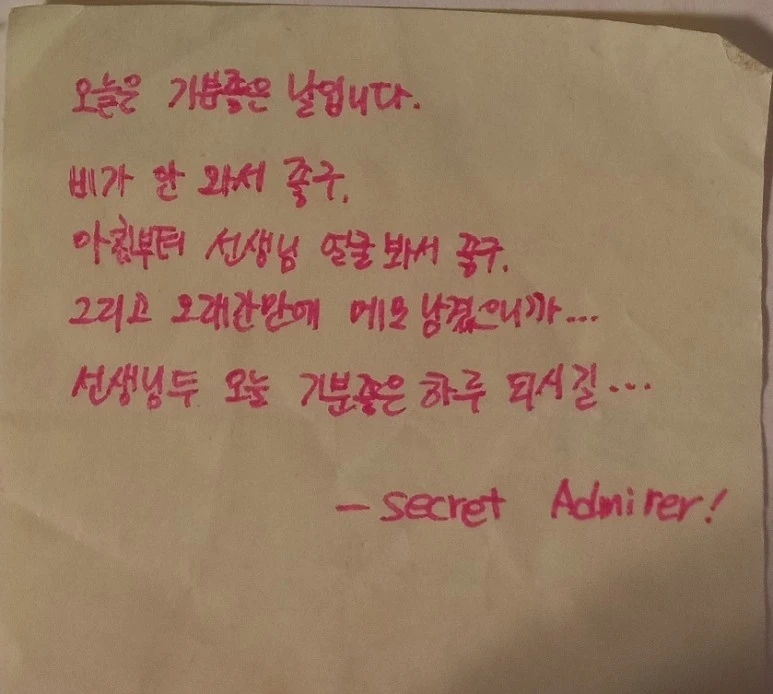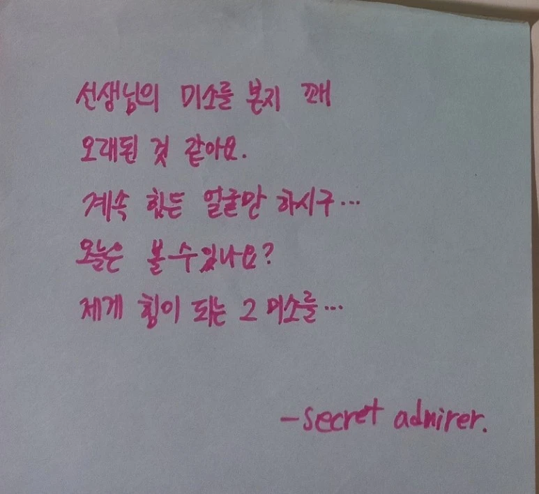 눈물나도록 고마웠던 위로와 격려의 메시지였다. 이번엔 누구인지 밝혔는가 했는데, secret admirer 그러니까 "몰래 짝사랑하는 이"라는 하나도 도움이 안 되는 힌트만 적혀있을 뿐이었다. 적어도 나에게 악의를 가지고 장난치는 건 아니라는 확신이 들긴 했다.