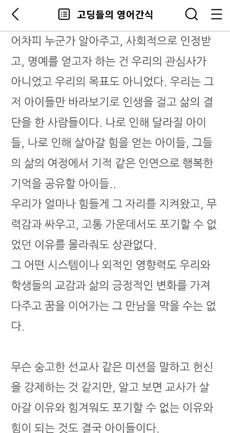 얼마 전 올렸던 “이름 모를 선생님을 추모하며”를 자신의 프사로 올리는 열심을 보이기도 했다. 캡처한 그 부분이 내가 특히 엉엉 울면서 오열하듯 썼던 부분이라서 놀라기도 했다.