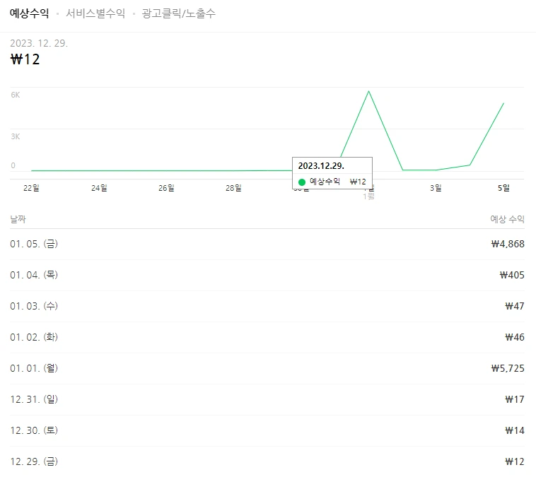일일 방문자와 조회수가 많고 노출과 클릭이 증가할수록 수익이 늘어난다는 단순한 원리 외에는 광고의 종류와 단가와 노출 및 클릭수에 따른 패턴은 아직 찾지 못했다.