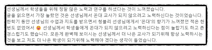 글을 읽으면서 가장 놀랐던 것은 선생님께서 꼰대 교사가 되지 않으려고 노력하신다는 것이었습니다. 한 학기 동안 선생님의 수업과 지도를 받으면서 청블리 선생님에게서 ‘꼰대’의 향기가 느껴졌던 적은 한 번도 없었어서 선생님께서 학생들에게 꼰대가 되지 않으려고 노력하신다는 점이 놀랍기도 하고 존경스럽기도 했습니다. 모든 게 완벽해 보이시는 선생님께서 더 나은 교사가 되기 위해 항상 노력하시는 것을 보고 저도 더 나은 학생이 되기 위해 노력해야겠다는 생각이 들었습니다.