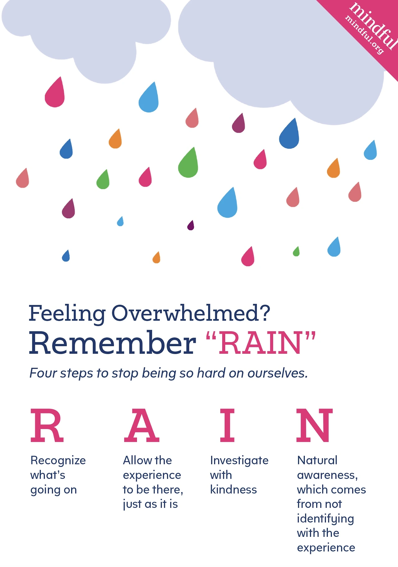 이러한 감정을 다루는 방법을 RAIN(Recognize, Allow, Investigate, Natural Awareness)이라는 기법으로 설명을 합니다.