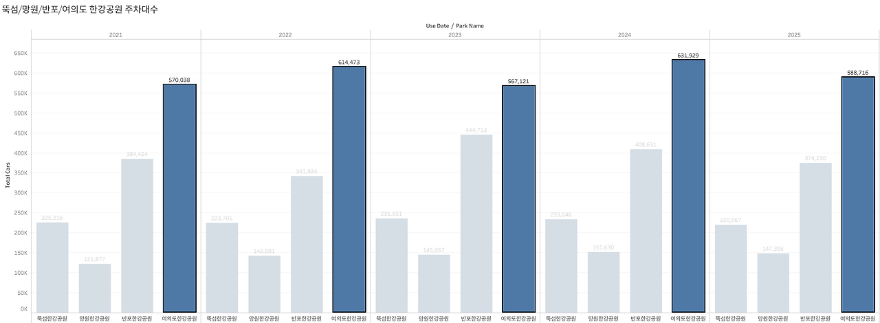 팬데믹 기간을 제외하고 2022~2025년 누적 주차량만 따로 계산해도 여의도는 여전히 전체 공원 가운데 가장 높은 값을 기록하며, 반포의 약 1.3배, 뚝섬의 2배 수준이다. 이는 여의도가 ‘가볍게 산책하러 들르는 공원’이 아니라, 차를 끌고 목적을 가지고 오는 방문이 집중되는 이벤트형 공원임을 보여준다. 드론쇼, 벚꽃축제, 불꽃축제 같은 특정 이벤트가 열리는 순간마다 서울의 인파가 가장 강하게 몰리는 공원은 결국 여의도라는 사실이, 정상화 이후의 데이터에서 명확하게 증명된다.