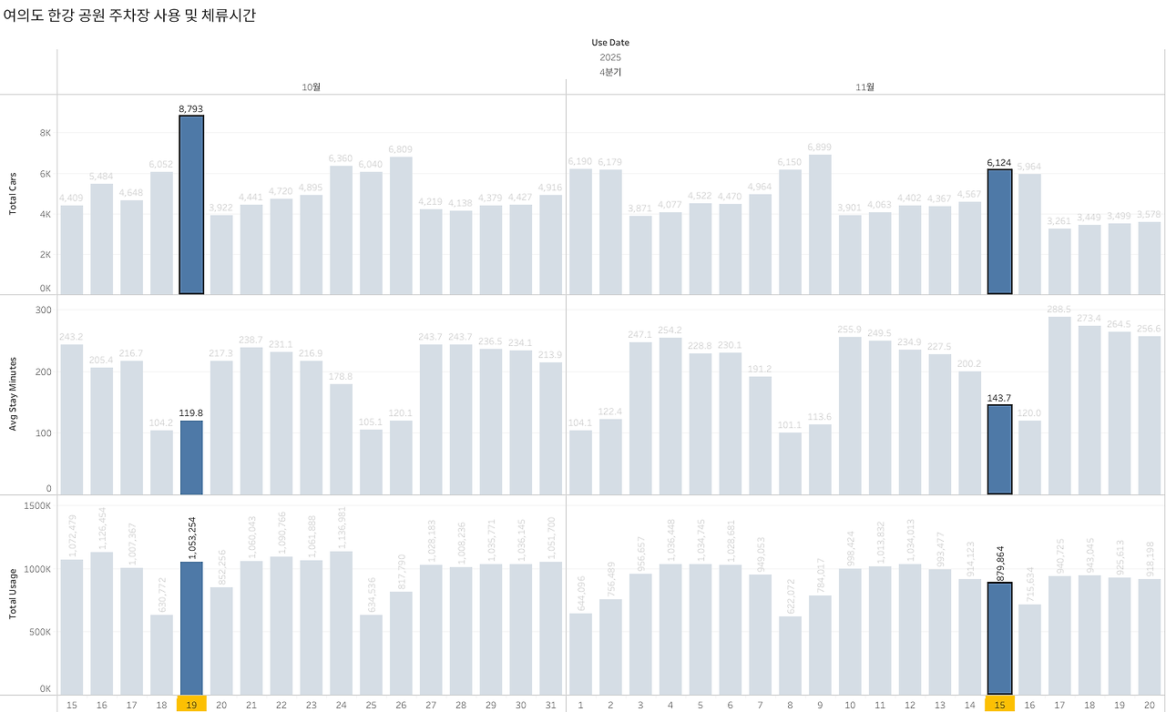 이 말은 곧, 평상시에는 비교적 여유 있게 머무는 사람들이 공원을 채운다면, 특정 이벤트가 열리는 순가에는 훨신 많은 사람들이 짧은 시간 안에 몰려들었다가 빠르게 빠져나가는 패턴이 만들어진다는 의미다. 실제로 2025년 10월 19일 종이비행기 축제, 11월 15일 드론쇼가 열린 날의 데이터를 보면, 주차장에 들어온 차량 수는 평소의 두 배 가까이 치솟지만 평균 체류 시간은 오히려 직전 며칠보다 낮게 기록된다.