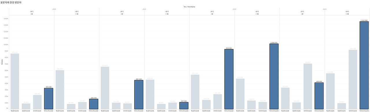 1) 4월/10월 뚝섬/망원/반포/여의도 한강 공원 방문자 수(2020~2023년)