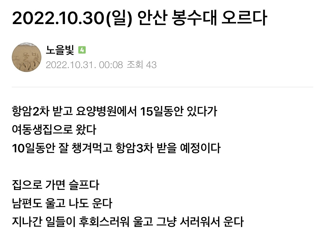 엄마는 본격적으로 항암치료를 시작하면서 하루하루를 카페에 기록했다.