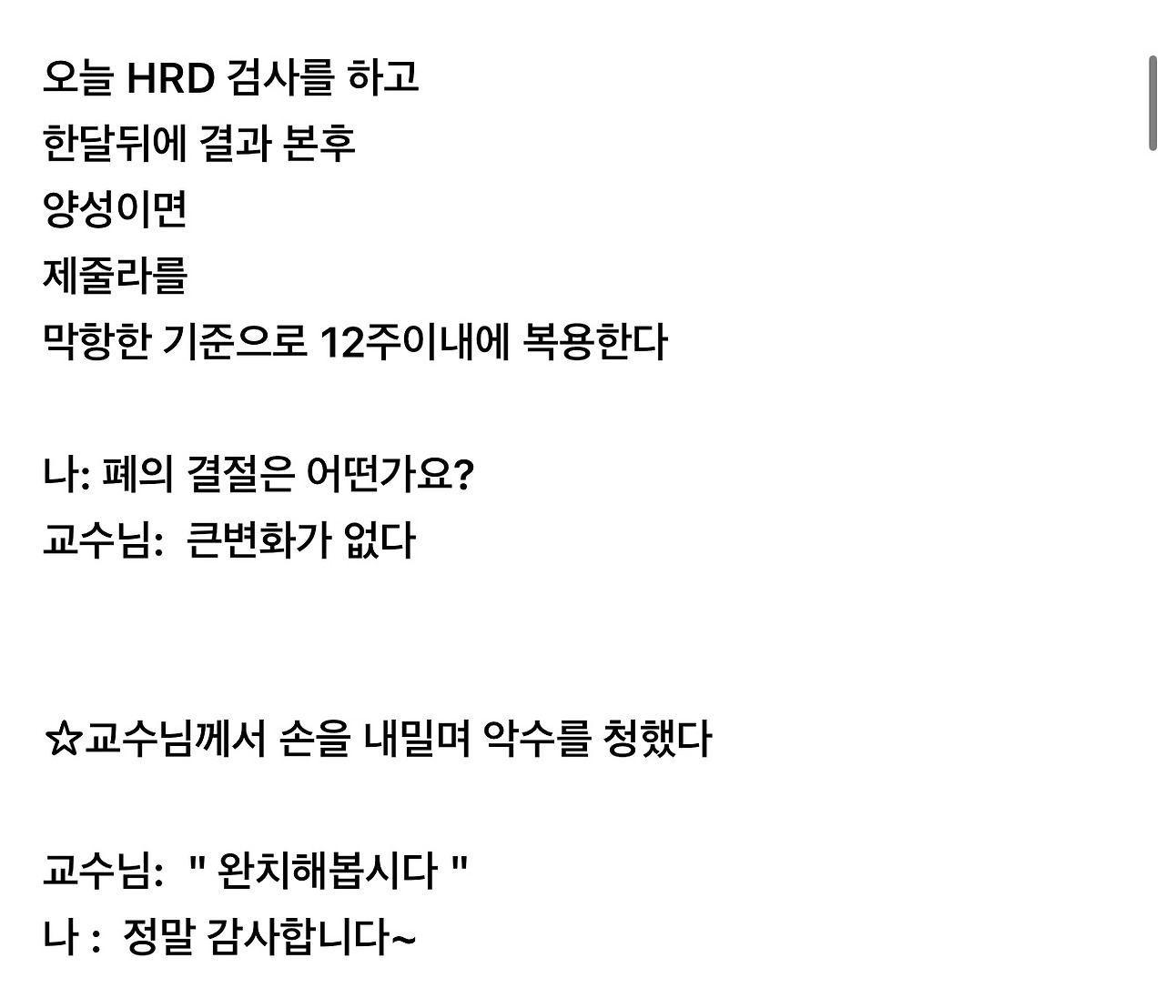 - 이런 생각 하면 안되는데... 정말 열심히 노력했는데도 검사 결과가 좋지 않아서 힘이 빠지네요. 가족들이 다 나 때문에 고생하는데, 결과가 좋아야 하는데요...