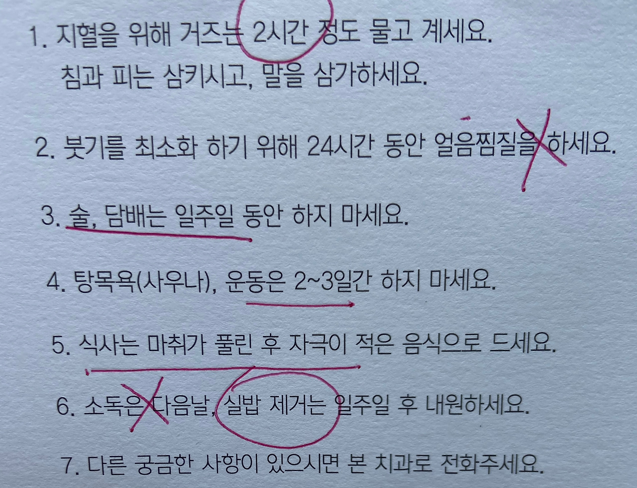 이를 뺀 후 간호사 누나들이 친절하게 종이 한 장을 쥐어 주며 모세의 십계 보다 조금 적은 7곱 가지의 지켜야 지침을 정성스레 설명해준다. 그딴 거 필요 없고 임플 비용을 VVIP 특별 할인을 적용해달라니까 찔끔해준다 한다. 매우 섭섭했다. 거의 1500의 매출을 올려 주었는데 기껏 찔끔이라니.