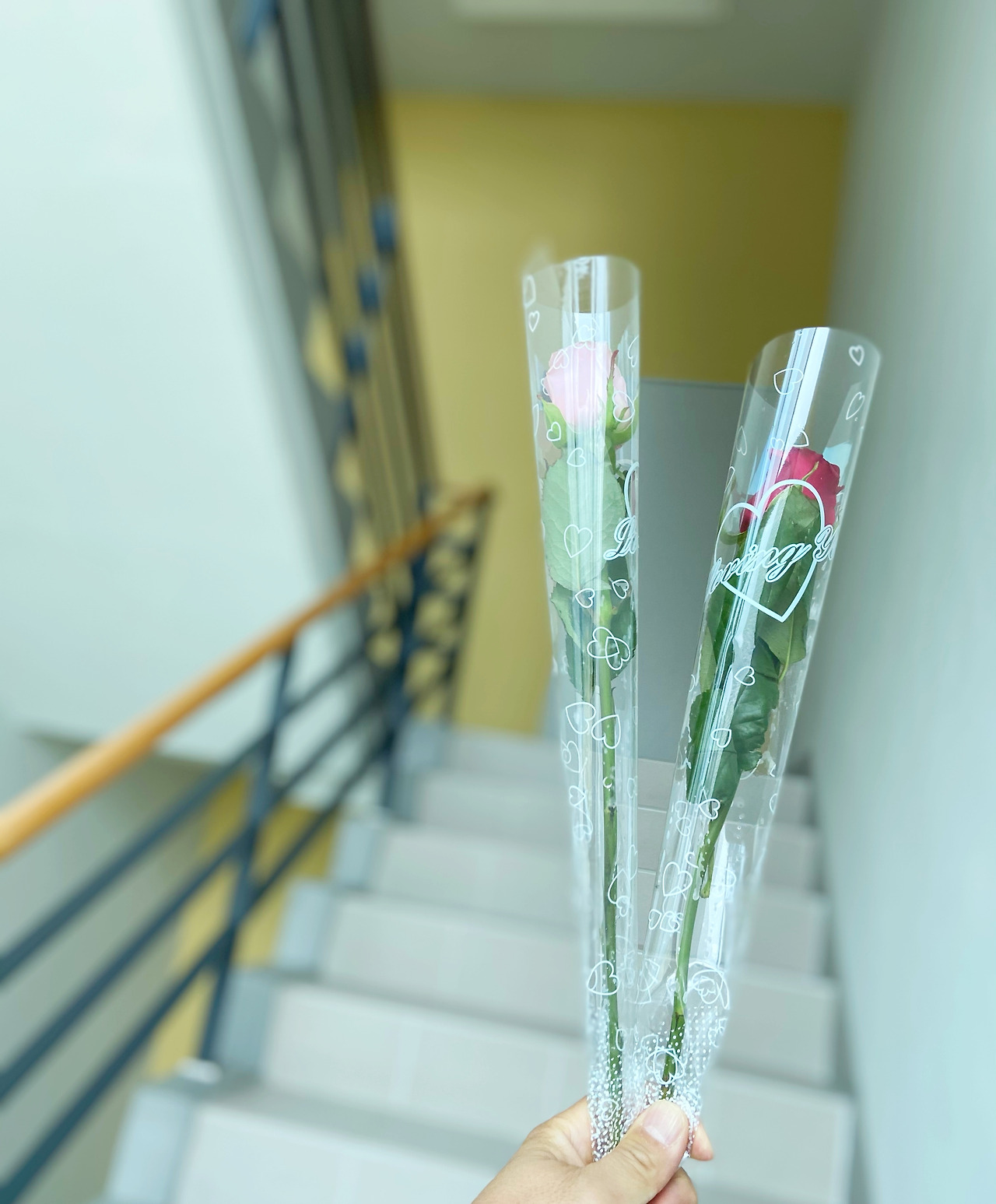 그러고 아침까지 까마귀 고기 먹은 듯 잊고 있었다. 그런데 어랍쇼, 1층 현관 입구에 비치된 장미 송이가 출근길 시선에 따악 걸렸다. 웬 횡재냐 싶어 굳이 한송이 가져가라는 지침을 개무시하고 분홍, 빨강 두 송이를 재빠르게 집어 들었다.