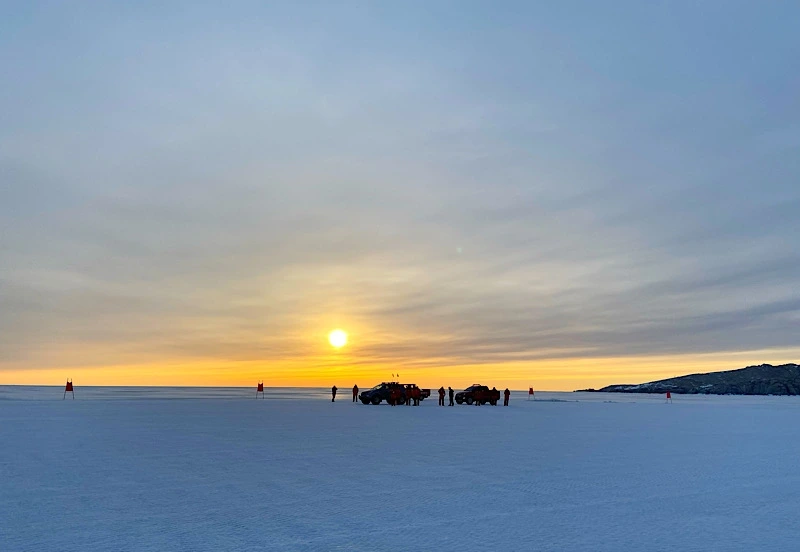 한국 사람은 한국 사람들이 기다리는 방향으로 가라는 안내에 따라 들어온 시야에는 공교롭게 백야임을 알리는 눈부신 태양을 등지고, 이른 새벽임에도 불구하고 기지대장님과 일부 대원님들이 이동 차량과 함께 환영을 해주심으로 남극에서의 짧은 체류가 시작되었습니다.