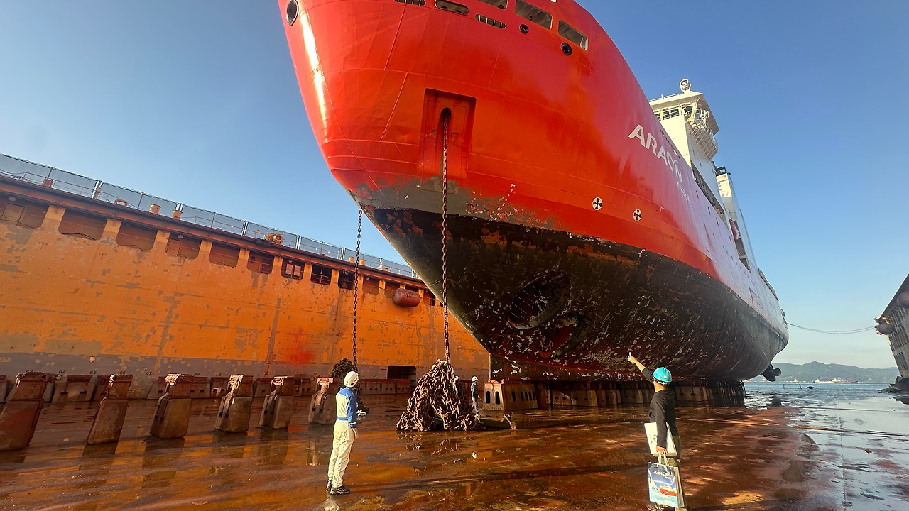 일반 화물선과 달리 쇄빙선과 연구선은 매년 물 위 검사를 시행하게 되는데 남극에서 얼음을 깰 때 쇄빙충격으로 인한 물아래 구조물의 손상여부를 확인해야 하고, 또한 바닥에 위치한 각종 검지기(Sensor)들을 보정(Calibration)하여 정확한 연구 데이터를 수집할 수 있게 합니다.