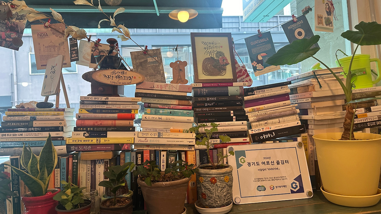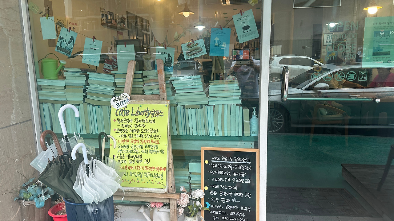 우리 아재감성의 선택은 망설임 없이 동네 카페, 그런데 이게 신의 한 수였다네요. 처음 출입구에 붙은 독서모임 안내문이 관심을 주었고, 내부에 놓인 그림과 책들이 보기에 좋았으며 결국 벽에 붙은 사진 강의 신청 광고로 사장님과 말문을 텄습니다.