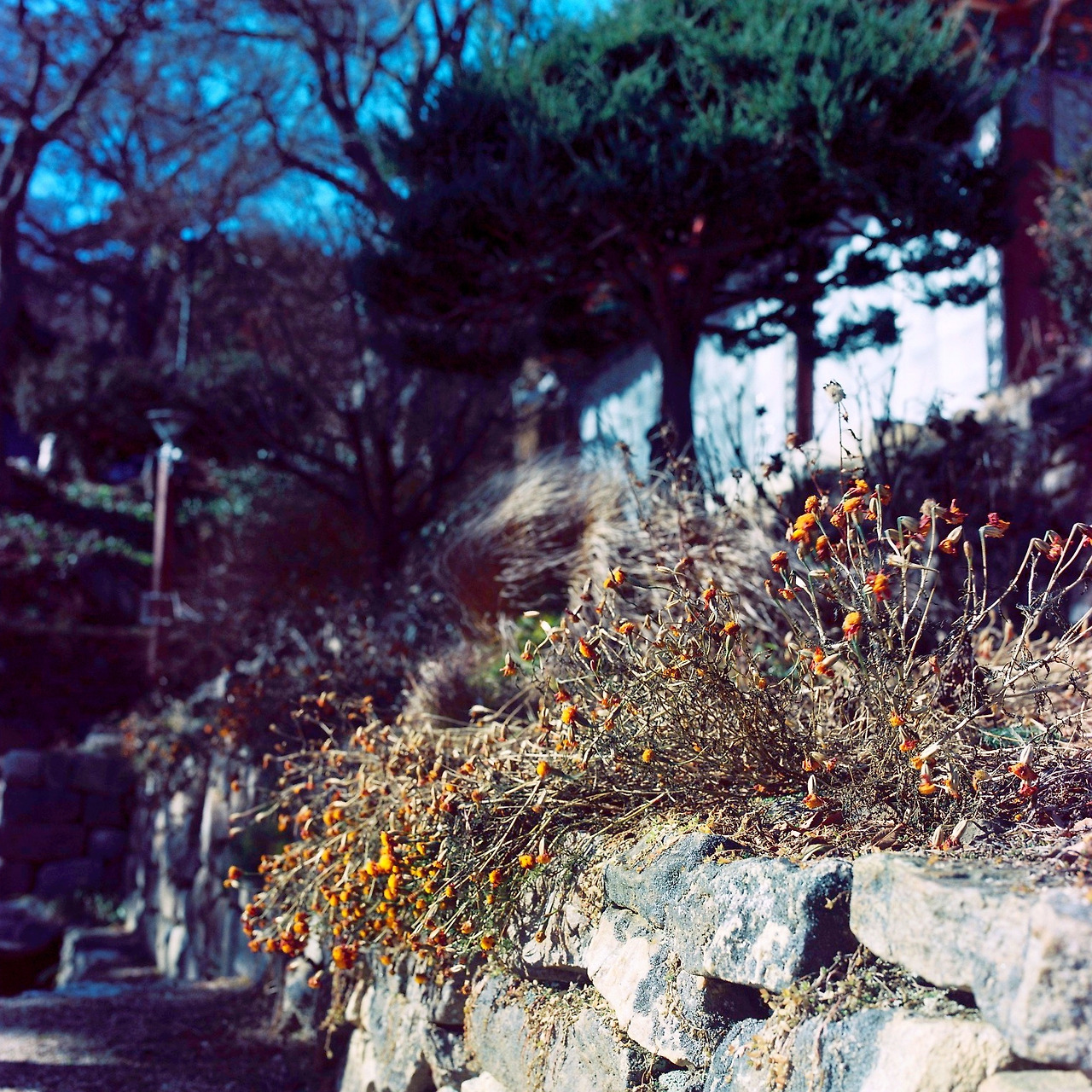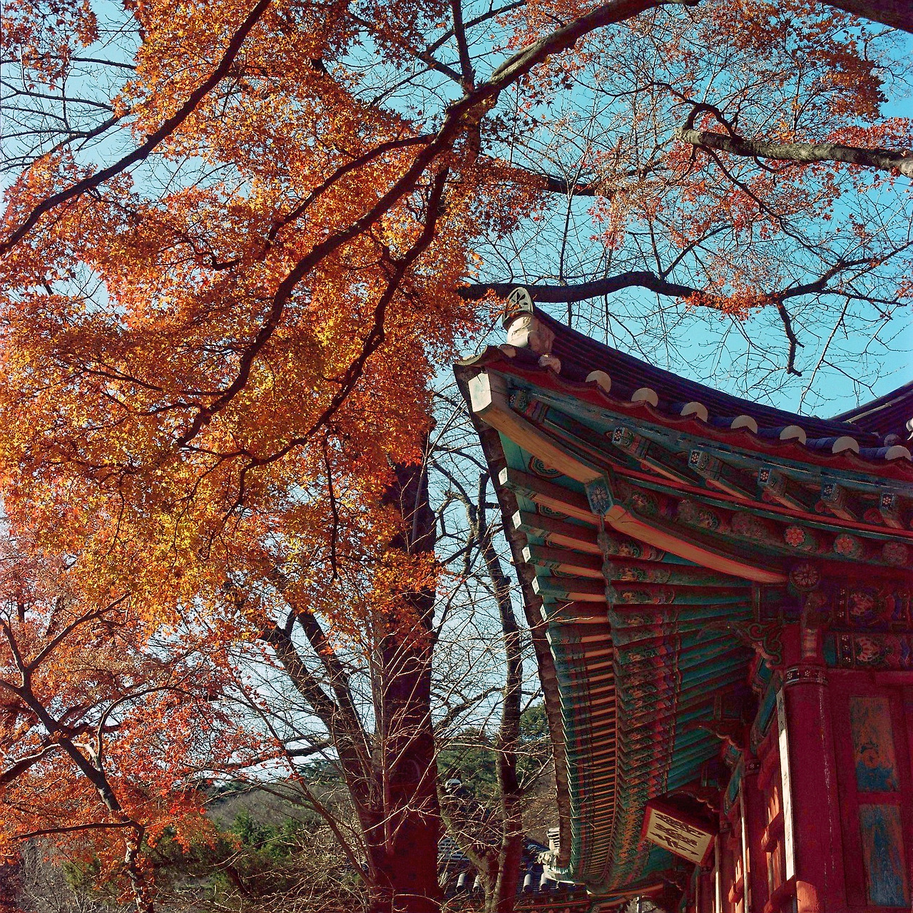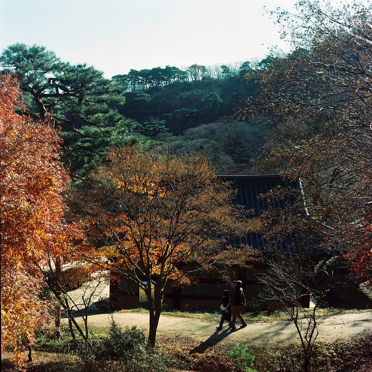 깊어가는 가을에 적당한 단풍, 절 지붕, 빛나는 햇살 그리고 15분 이상 기다림에 끝에 만난 다정히 지나가는 두 사람. 고생과 애착은 크지만 결과는 썩 아닌 듯 한 아쉬움.