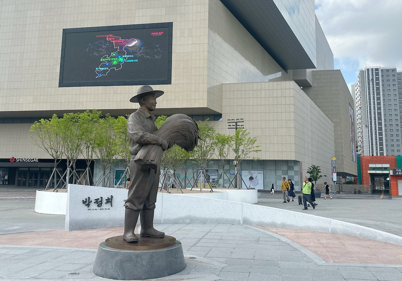 동대구역이다. 지하철을 내려 역사로 가려면 시간이 조금 소요되는 것 외에 말도 많고 탈도 많은 박정희 대통령 동상을 지나치게 되었다. 그저께 택시 기사님께서 시장이 관두고 또 철거가 논의 중이라 투덜거린, 미래를 예측하기 거시기한 설치물이긴 틀림이 없다.