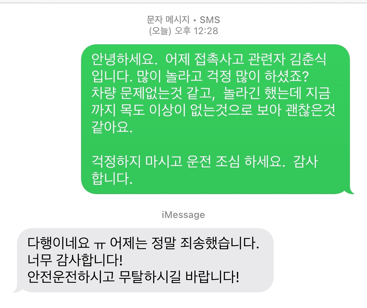 다음날 마음이 급했어요. 그 운전자가 F 성격이라면 마음 고생할게 생각나서 이고 늦어진 게 차와 목 상태 확인에 시간이 소요된 사유입니다. 다음날 목이 뻐근할 수 있다 하는 널리 퍼진 풍문 때문이겠죠. 전화할까 하다 문자를 보냈어요. 괜찮다고요.