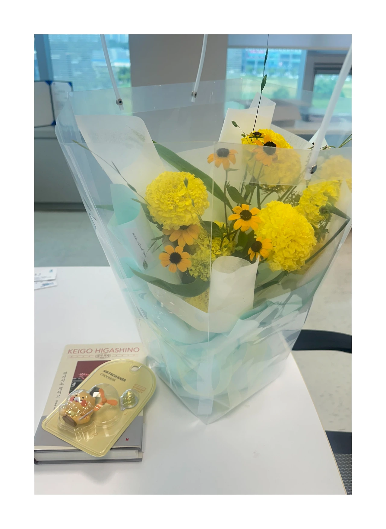 장대비에 대중교통편이 지연되어 약속을 지킨다 택시를 타고 왔다 하며 미안해하는 모습에 오히려 제가 머쓱 해졌습니다. 비 오는 날에 손이 무겁다는 것이 귀찮을 법한데 한 손엔 꽃과 책을, 다른 한 손에는 달달한 도넛 두통이 들려 있습니다. 꽃은 이전 바다의 날 포상 축하의 의미로, 책은 추리물 좋아한다 골랐다 하네요. 도넛은 우리 실 직원용이라 챙겼다 하니 마음이 참 곱습니다. 뭐 이럴 때는 감동을 받을 만하겠지요.