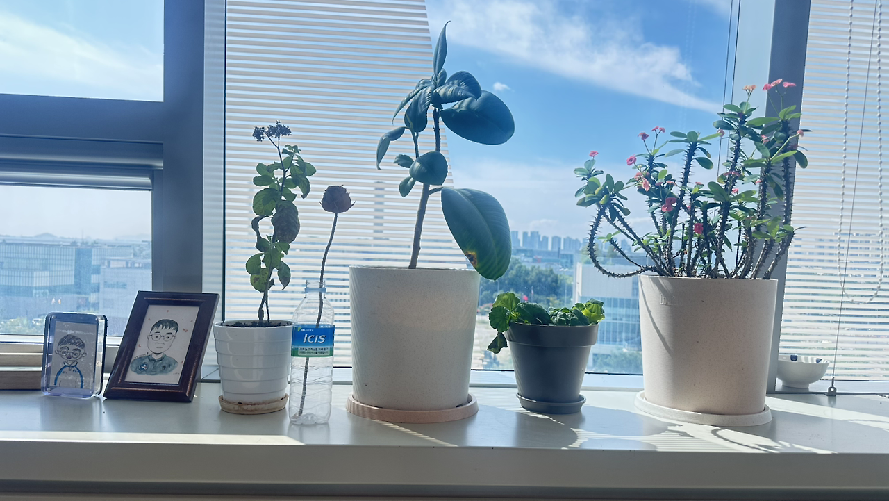 몇 개인 사무실 화분은 나름 사연이 있습니다. "꽃기린"은 집에서 버려야 할 처지가 된 가지 하나를 작은 화분에 심어 사무실로 가져온 것으로 그것도 생명이라고 살아야겠단 마음이 있었던지 생각 외로 무럭무럭 자라 준 것이고, "고무나무"는 잘라 버리는 가지를 다른 화분에 꽂아 둔 게 신기하게 뿌리가 자라고 다른 식물과 공생하던 것입니다. "제라늄"은 다른 부서에서 화분 통째로 쓰레기통에 버린 것을 가져와 살린 게 5, 6년 전이고 "마른 장미 한 송이'는 코로나 시대에 우리 총무실 직원이 위로차 1층에서 나누어 준 것을 말려 둔 것, "헬리오트프로"는 이번 포장을 받았을 때 우리 실 직원으로부터 축하로 받은 것입니다.