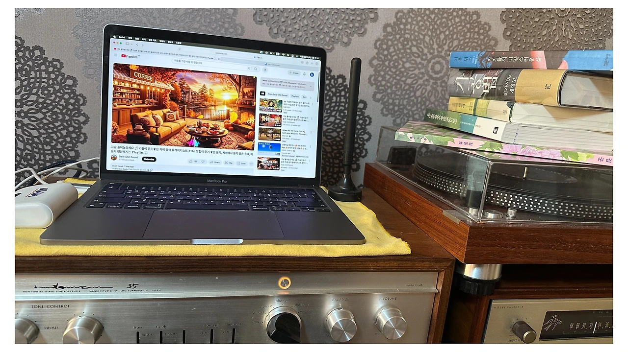 일찍 일어 나는 날이면 진공관 앰프에 빨간 불이 보이도록 전원을 넣고 가을을 노래하는 카페음악과 책으로 시작한다. 따스한 붉은 주황 계통의 가을 낙엽색 배경에 국룰처럼 Coffee 란 글과 컵에서 올라오는 모락 증기가 그래픽 되어 있다.