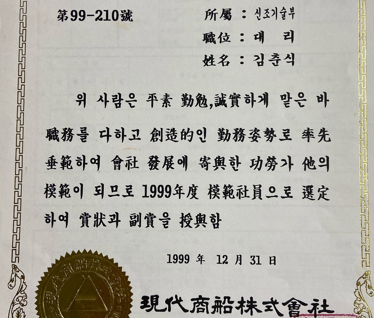 5년 동안의 배 타는 생활을 마무리하고, 울산 현대중공업 내에 있는 현대상선 신조기술부에 발령받아 95년 1월 19일 첫 출근으로 바다에서 시작된 인연을 육지에서도 계속 이어갔다. 첫 출근일을 기억하는 것은 하루 일찍 출발해 울산 숙박시설에서 1 박하면 될 것을 당일 새벽, 대구 동부 정류장에서 울산으로 가는 첫 버스를 탔었고 그게 입석이어서 순진한 뱃놈이 육상직 첫 출근에 두근두근 긴장된 두시간 내내 마음도 몸도 힘들었던 긴 날로 기억되기 때문이다.