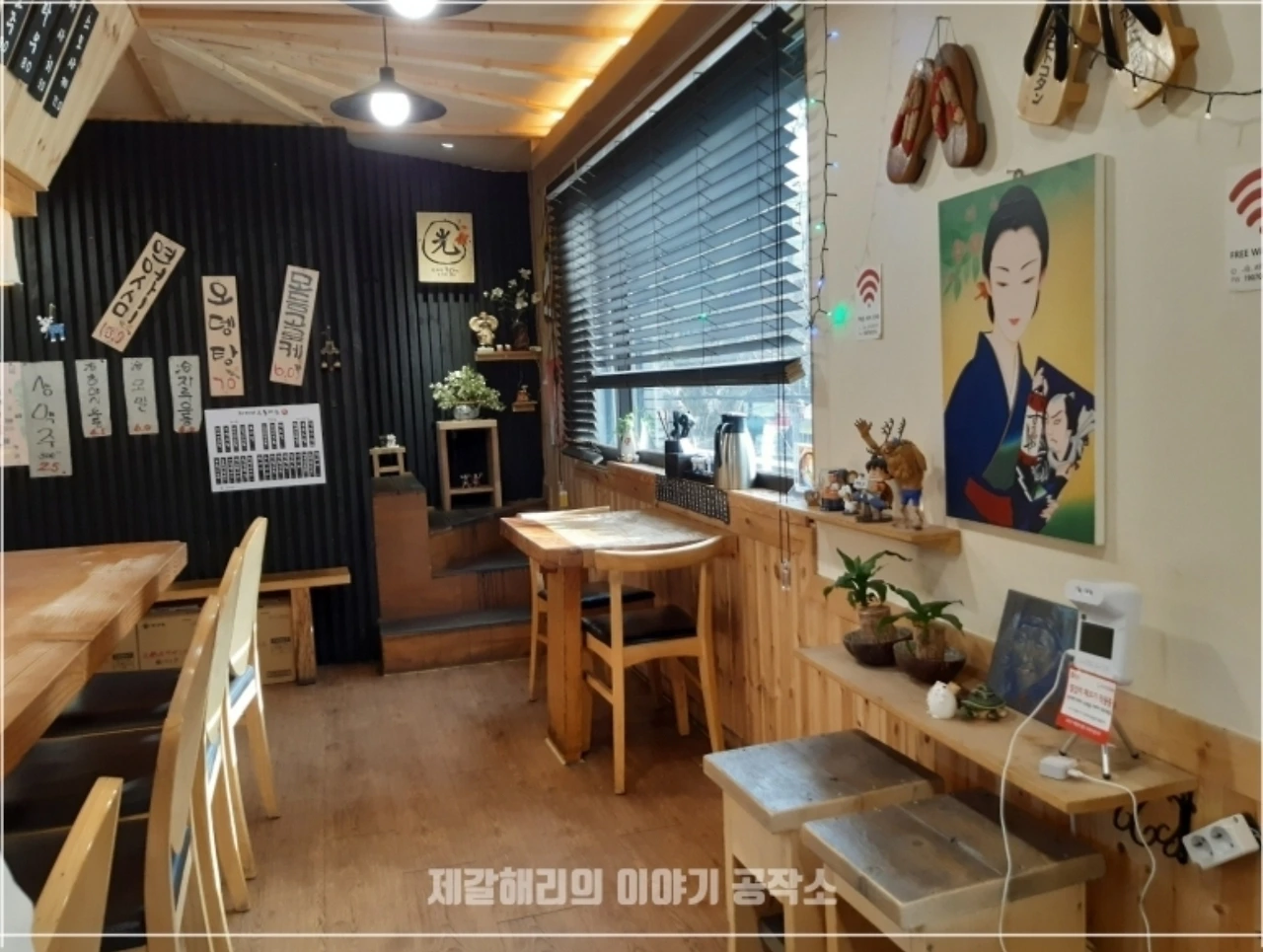명지전문대학을 다닐 때, 나는 새절역에서 학교까지 걸어 다니다가 마침 길가에 있는 작은 일식집 하나를 발견했는데, 그 일식집이 바로 히카리 우동이었다. 그때는 지금처럼 비교적 규모가 크지 않은, 협소한 공간이었는데, 좌석도 5, 6개 정도밖에 되지 않았다. 후덕한 인상(다르게 보면 무서운 인상일 수도...)의 사장님이 항상 맛있는 음식과 함께 세상 사는 이야기, 그림 이야기, 일본 이야기 등을 곁들여 주셔서 나는 어느새 히카리 우동의 단골이 되어 있었다.