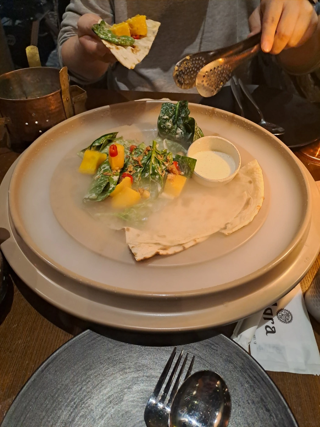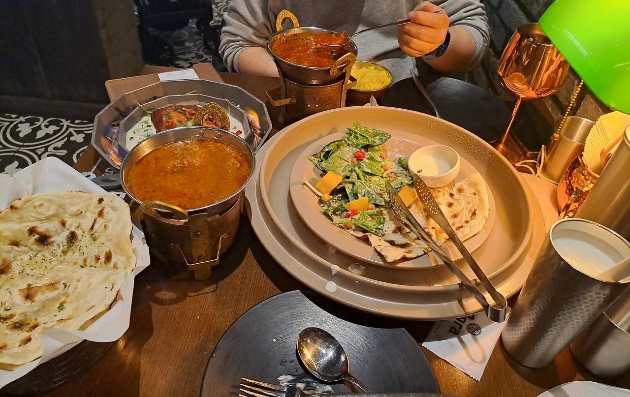 망고 스노윙 브레드가 먼저 나왔고, 우리가 이 샐러드와 난을 함께 먹고 있을 때, 클래식 라씨와 와인 에이드 음료 두 잔과 치킨 반달루와 인디안 치킨 두 개의 커리 소스가 나왔다. 그 뒤로 탄두리 치킨, 라이스, 난 이런 순서로 나왔다. 망고 스노윙 브레드는 망고가 약간 해동이 덜 된 것 같았지만, 그래도 채소의 식감이 살아 있어 먹을 만했다. 치킨 반달루 커리는 약간 매콤했지만, 달달하면서 매콤해서 나름 맛있었다. 인디안 치킨 커리는 담백하면서도 달달했다.