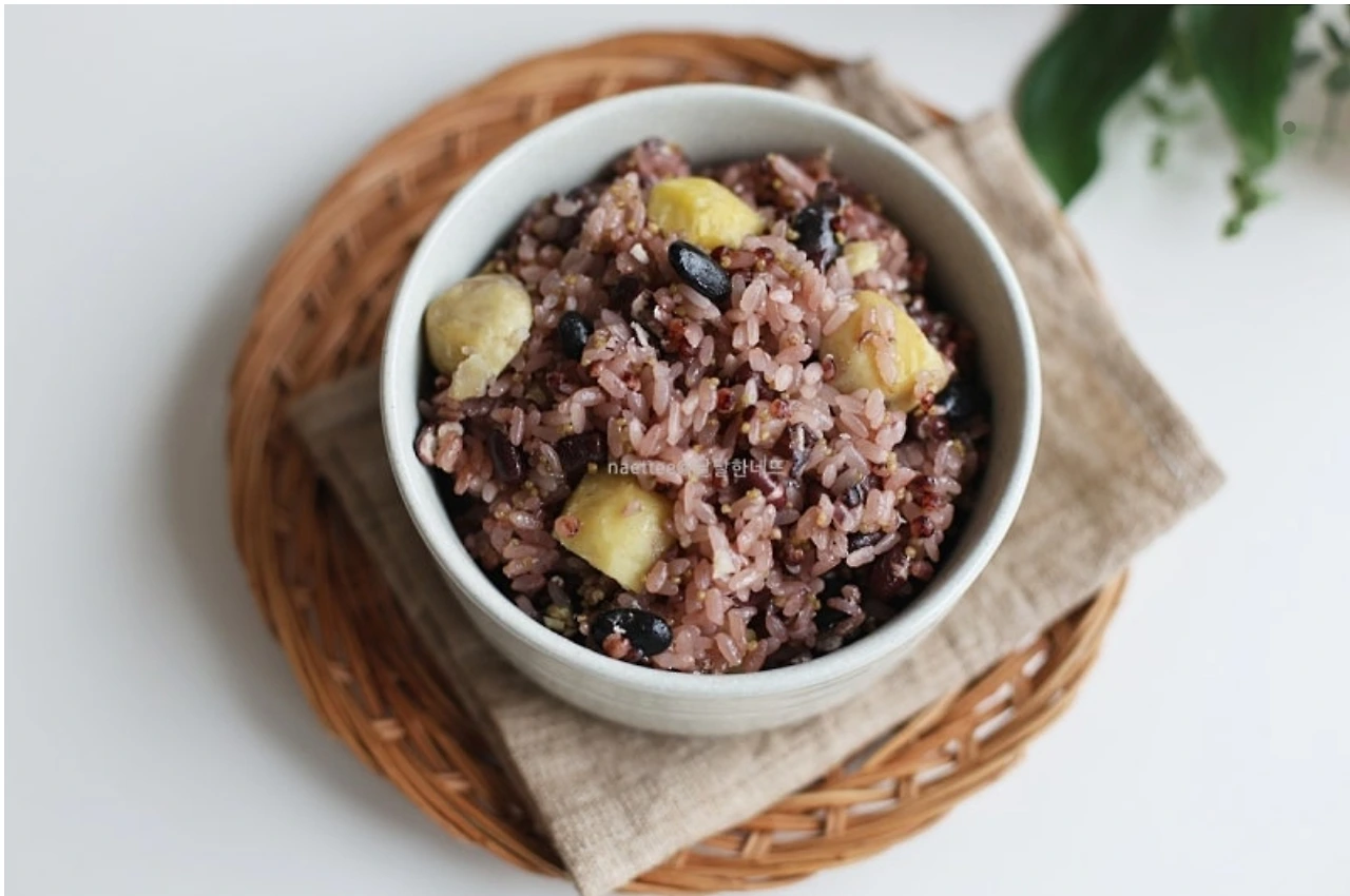 찹쌀, 기장, 수수, 서리태, 적두를 섞은 풍년을 기원하는 잡곡밥이다. 왜 굳이 오곡밥이냐 하면 과거 가을 추수 때 가장 잘 자라던 곡식들을 모아 한 밥공기에 담으니 다섯 가지의 곡식이 있었다는 데서 유래했기 때문이다. 일반 쌀이 아닌 찹쌀을 쓰기 때문에 밥물을 일반 밥을 할 때보다 적게 넣어야 한다.