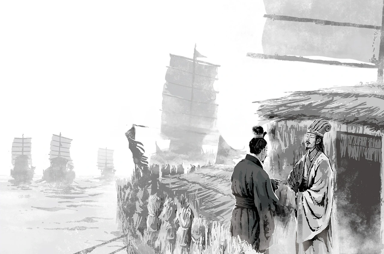여기, 2천 년 전 수많은 영웅호걸들이 살았던 중국의 삼국시대에서 그 해답을 찾아보자. 위오촉이 패권을 두고 다퉜던 서기 208년, 장강의 적벽에는 제갈량, 주유, 노숙 세 사람이 있었다. 조조가 소위 백만 대군을 이끌고 형주를 점령해 형주자사인 유종의 항복을 받아내고, 신야에 머물던 유비는 자신을 따라오는 백성들과 함께 조조군에 쫓겨 강하로 피신하게 된다. 그 후, 조조는 장강 너머 동오의 손권에게 서신을 보내 항복을 권고한다. 이에 동오의 진영은 장수들이 모인 주전파와 관료들이 모인 주화파로 나뉜다. 관료 출신이지만, 주전파였던 노숙은 전 형주자사였던 유표의 죽음을 조문한다는 명목하에 유비군의 동정을 살피러 강하로 찾아온다. 여기서 노숙은 유비의 책사 제갈량을 만나 조조군의 허실을 알게 되고, 제갈량에게 자신의 주인인 손권을 만나보기를 청한다. 제갈량도 손권을 만나 담판을 지을 요량이었기에 선뜻 따라나선다.