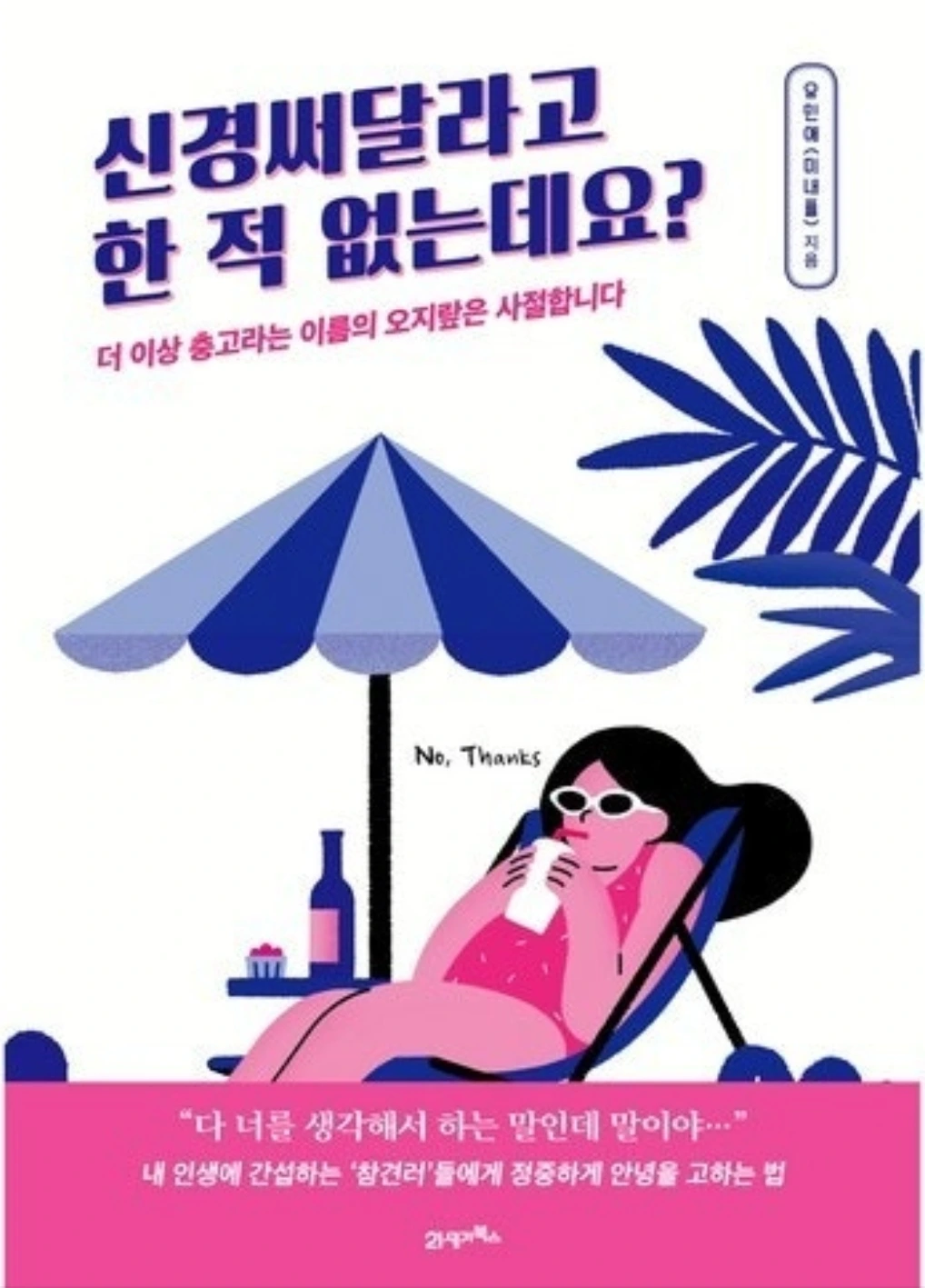 그때, 내 눈앞에(정확히 말하면 인터넷에서 검색하다가 발견했지만) 나타난 책이 바로, 미내플의 <신경 써 달라고 한 적 없는데요?>였다. 이 책을 찬찬히 들여다보면서 나는 내가 그동안 주변 사람들의 조언에 불편함을 얼마나 감수해야 했는지 알 수가 있었다. 그리고, 그 불편함을 나만 느끼는 것이 아니라는 것을 알게 되었다.