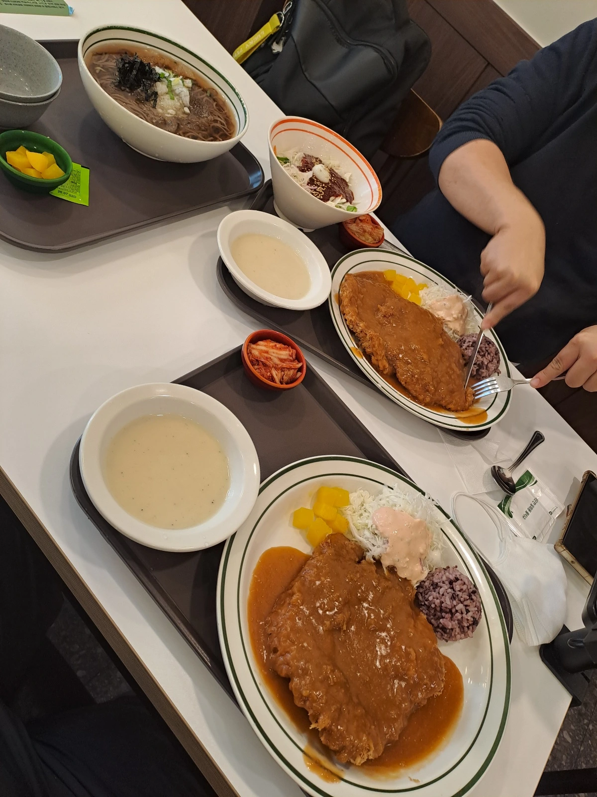 우리는 내 몫의 경양식 왕돈가스, 꼬북이 몫의 경양식 돈가스, 미니쫄면, 냉메밀을 먹기 시작했다. 돈가스는 소스가 달지도 않고, 부드러운 것이 먹어도 먹어도 질리지가 않는 맛이었다. 돈가스 고기 자체는 부드럽게 씹히는 질감이 수준급이었다. 돈가스의 밥은 흑미였는데, 찰진 것이 돈가스와 함께 먹기에 좋았다. 미니쫄면은 매콤하면서도 감칠맛이 나서 너무 맛이 좋았다. 양이 너무 적어 아쉬웠는데, 식사쫄면을 시킬 걸 하고 후회했다. 냉메밀도 짭조름한 것이 맛있었고, 면이 탱글탱글했다.