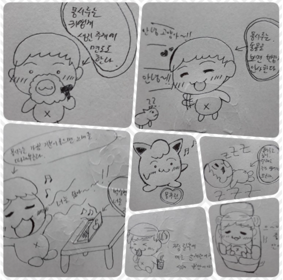 두 번째, 나의 카카오톡 프로필 사진은 애인 님이 그려준 몽시루(애인이 필자를 부르는 애칭) 그림 사진이다. 애인은 미대에 지망할 수 있을 정도로 그림을 잘 그렸었는데, 부모님이 반대하셔서 미대에 가질 못했다. 그래도 아직까지 그림 실력은 남아 있어서 내 캐릭터 몽시루를 만들어줬다. 애인이 그려준 몽시루 캐릭터는 여러 가지가 있는데, 면도하는 몽시루, 잠꼬대하는 몽시루, 노래 따라하는 몽시루, 찜질방 가서 노는 몽시루 등 다양한 몽시루들이 있다. 독자 분들에게 보여 드린다.
