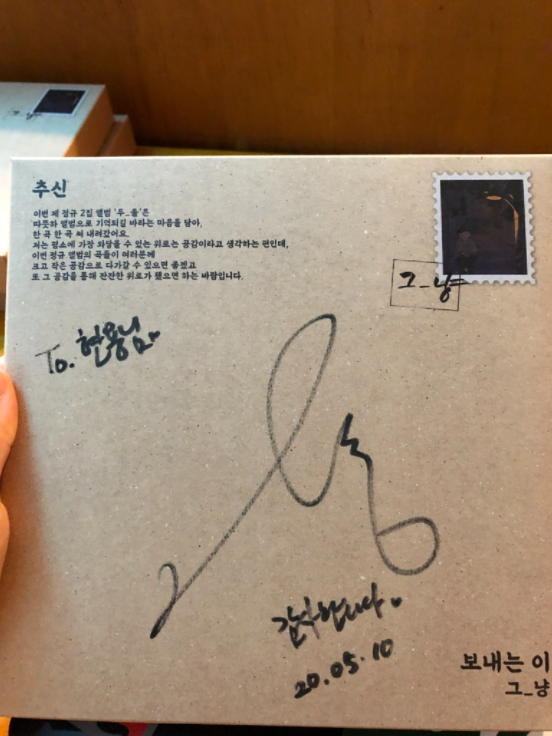 그렇게 '그_냥' 님의 팬이 되어 음악을 즐기고 있던 중, 홍대 라이브카페 카페언플러그드에서 기획 일을 하는 여동생이 선물로 '그_냥' 님의 앨범을 주었다. 그것도 그의 싸인이 적혀 있는 앨범을 말이다. 아마 그날 '그_냥' 님이 여동생이 일하는 라이브카페에서 공연을 하셨던 것 같았다. 하늘을 날아갈 듯 기뻤다. 그래서 얼른 앨범을 열어 보았다. 앨범 안에는 '그_냥' 님의 곡 CD와 그의 캐릭터가 그려진 스티커, 그의 앨범 자켓 사진이 들어 있었다. 나는 앨범 자켓 사진을 내 침대 옆의 벽에다 붙여 놓았다. 침대에서 일어날 때마다 그의 얼굴을 보려고 말이다. 그리고 캐릭터 스티커는 노트북에다 붙였다. 캐릭터가 너무 귀여웠다. 그 뒤로 1년이 지난 지금도 '그_냥' 님만 생각하면 기분이 너무 좋다. 그의 노래를 독자 분들도 꼭 들어봤으면 좋겠다.