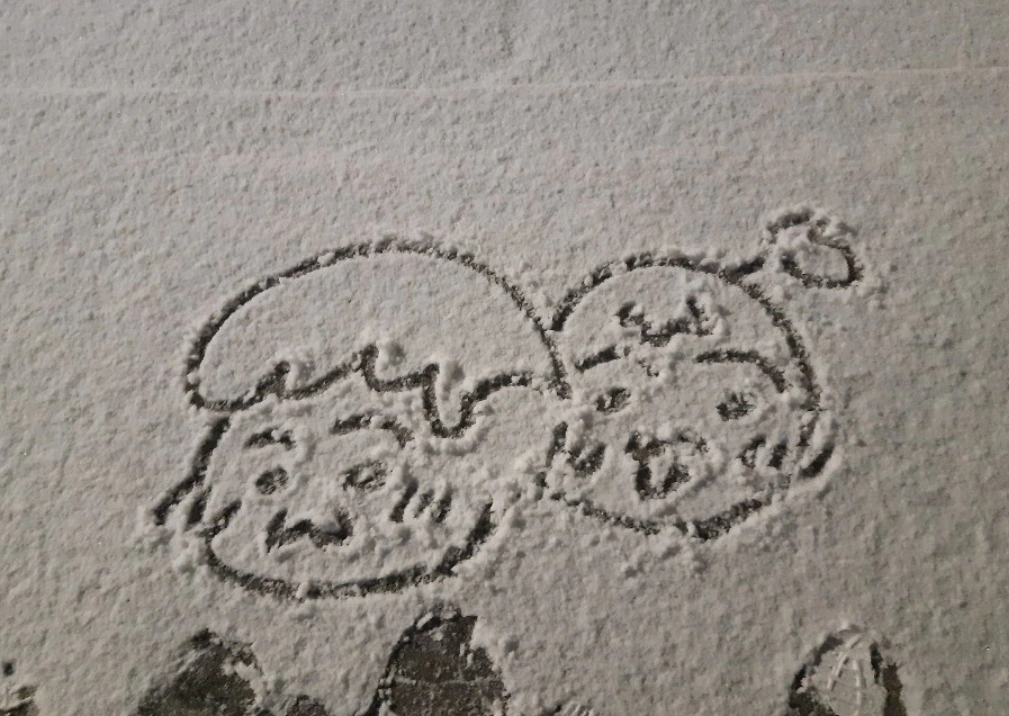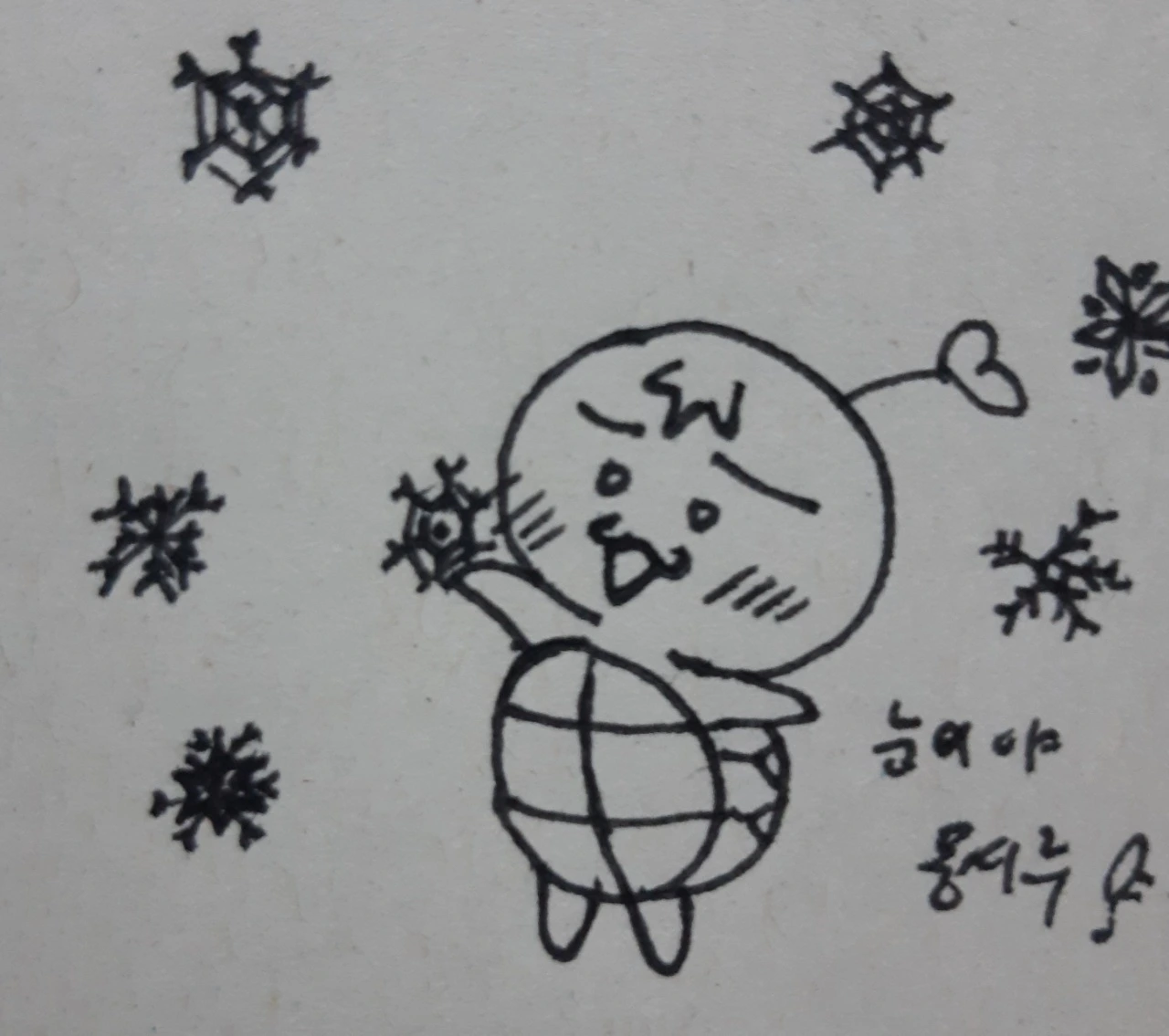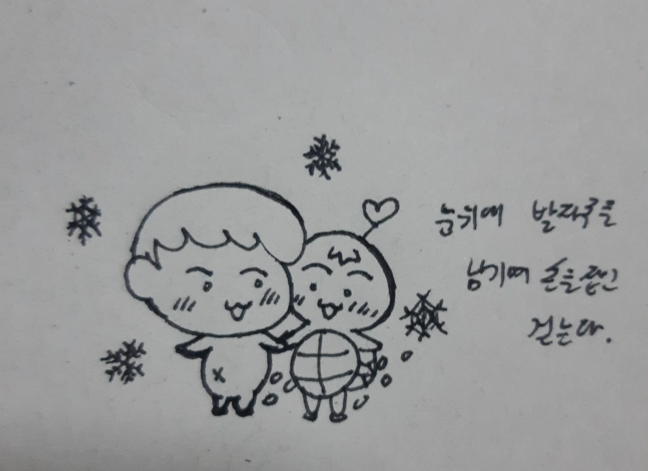 그리고 눈 위에 몽실이와 꼬북이 캐릭터가 서로 붙어 있는 그림을 그렸다. 우리는 눈이 쏟아져 내리는 가운데, 서로를 껴안고 즐겁게 눈을 즐겼다.