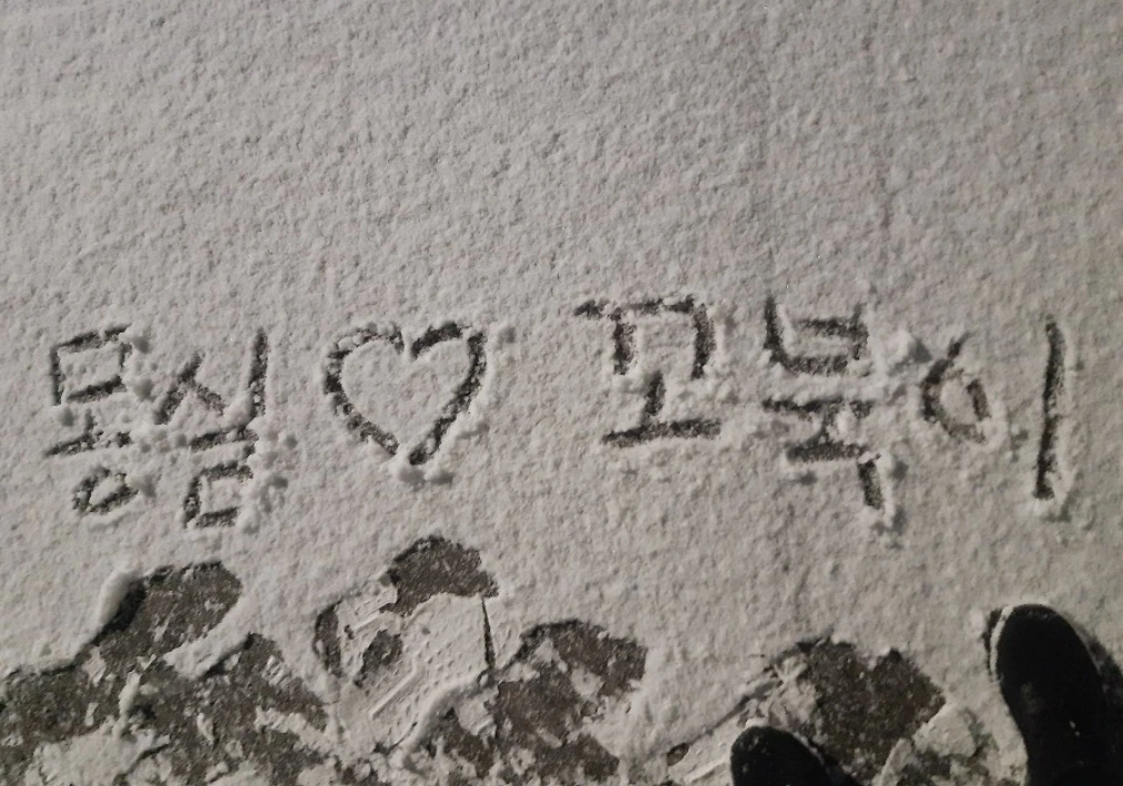 꼬북이의 고향은 포항이라, 눈이 온 것을 거의 본 적이 없다고 했다. 그래서 형이 서울로 올라온 2018년 그 해, 우리는 함께 눈을 보았더랬다. 그 뒤로 계속 눈을 보지 못하다가 펑펑 쏟아지는 눈을 드디어 보게 되었다. 꼬북이는 눈 오는 것에 신이 나서 눈 쌓인 땅에 '몽실♡꼬북이'라고 썼다.
