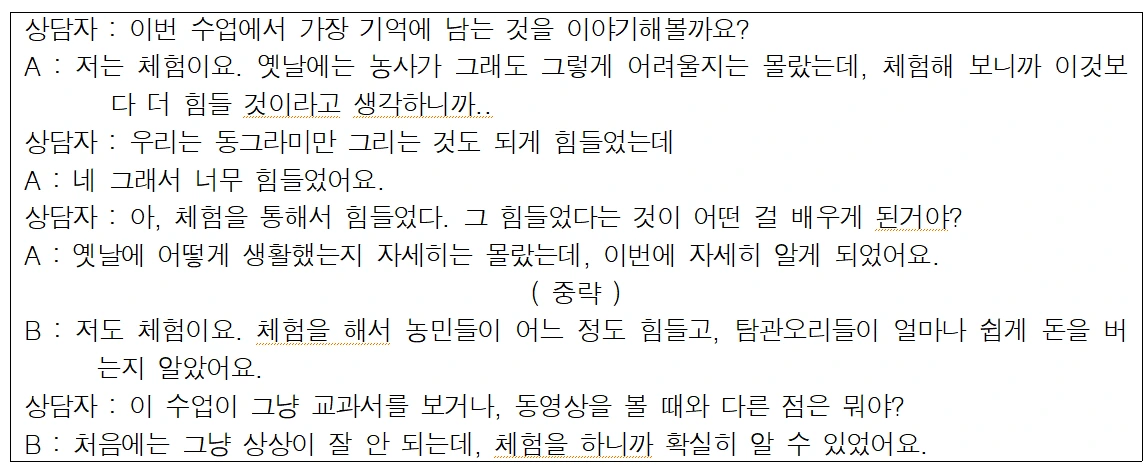 이 짧은 인터뷰에서 교사의 수업에서 ‘배움’이 일어났다고 생각하는 장면이 교사와 학생의 인식이 다르다는 결론을 생각해볼 수 있다. 이를 조금 더 깊이 생각해보면 결국, 수업의 주체인 학생들은 수업을 수동적으로 ‘듣는 것’을 원하는 것이 아니라, 수업에서 ‘하는 것’, 직접 참여하는 것을 원한다고 할 수 있다.