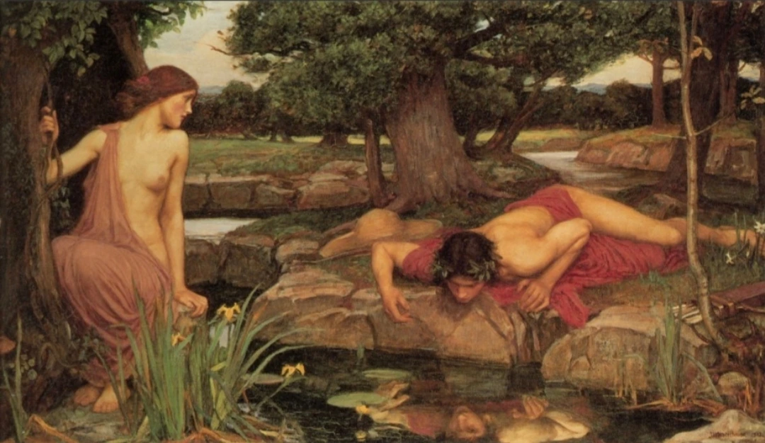 아름다운 미소년 나르키소스는 많은 청년과 소녀들의 애간장을 녹이지만, 강한 자존심은 그 누구도 허락하지 않아요. 그중에는 숲의 님페 에코도 있었어요. 그녀의 수다를 듣다가 제우스의 불륜 현장을 놓친 헤라는 그녀의 입을 막아버리고, 그녀가 사람들의 뒷말만 따라 말할 수 있는 저주를 내렸어요. 그런 그녀가 사냥을 하던 나르키소스에게 사랑에 빠지지만, 그는 매정하게 그녀를 뿌리쳐요.