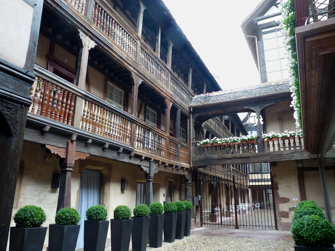 16세기에 지어진 스트라스부르 전통 목조 가옥을 그대로 살린 예쁜 부티크 호텔이 있다. ‘꾸흐 뒤 꼬르보(Cour du Corbeau)’라 불리는 16세기에 지어진 오래된 여인숙인데 이곳은 중세에 주로 어부들이나 뱃사람들이 모여 살았던 지역에 있는 여인숙이었다. 그런데 이곳에 묶었던 사람들의 면모를 보면 이곳이 싸구려 여인숙은 아니었음을 짐작할 수 있다. 볼테르, 프러시아의 프레드릭 대제(Frederick the Great of Prussia), 오스트리아의 조세프 2세 황제들의 이름이 보이니 말이다. 이 집의 특징은 건물을 둘러싼 발코니가 모두 나무로 만들어져 있으며 나무를 보존하기 위해서 소의 피를 사용했다고 한다. 이것이 알자스 지방의 전통 건축 방식이라는데 어째 기분은 좀 그렇다. 알자스 전통 가옥이라는 것으로 유명세를 타면서 현재는 파리의 부티크 호텔들에 견주어질 정도로 깨끗한 시설의 부티크 호텔로 운영 중이다.