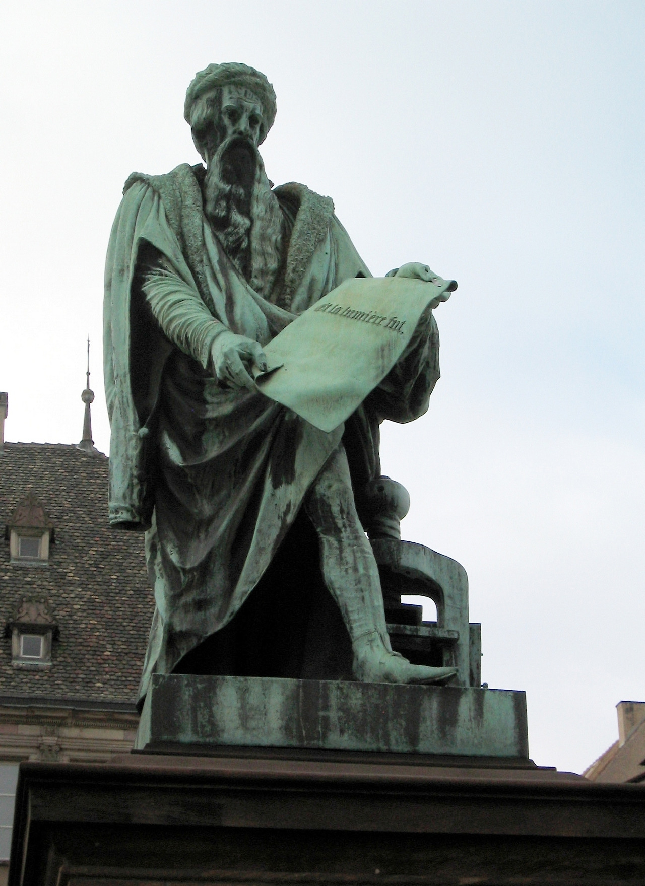 그런가 하면 구텐베르크의 인쇄술 발명을 기념하는 동상도 있다. 그는 1433-1445년까지 ‘스트라스부르’에 살았었고 그의 인쇄술이 처음으로 빛을 본 것도 이곳이라고 한다. 동상에 그가 들고 있는 동판에는 'Et la lumiere fut'(그리고 거기에 빛이 있었다.)라는 구약의 구절이 새겨져 있다. 그의 발명 400주년을 기념하기 위해 스트라스부르 사람들이 새겨 넣었다고 하는데 그의 동상을 바라보다 보니 잠시 안타까운 마음이 든다.