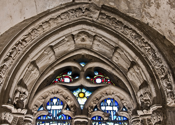 성당 입구 창문에 장식된 생 클레어 가문의 문장인 십자가