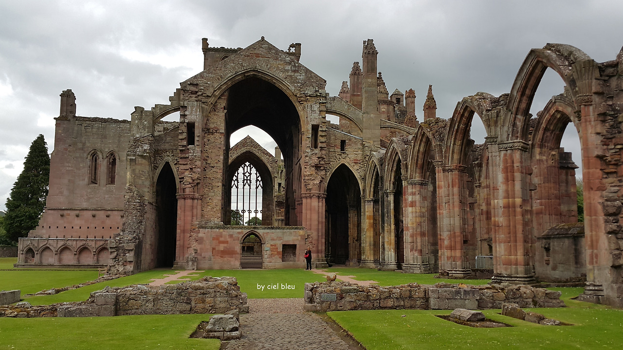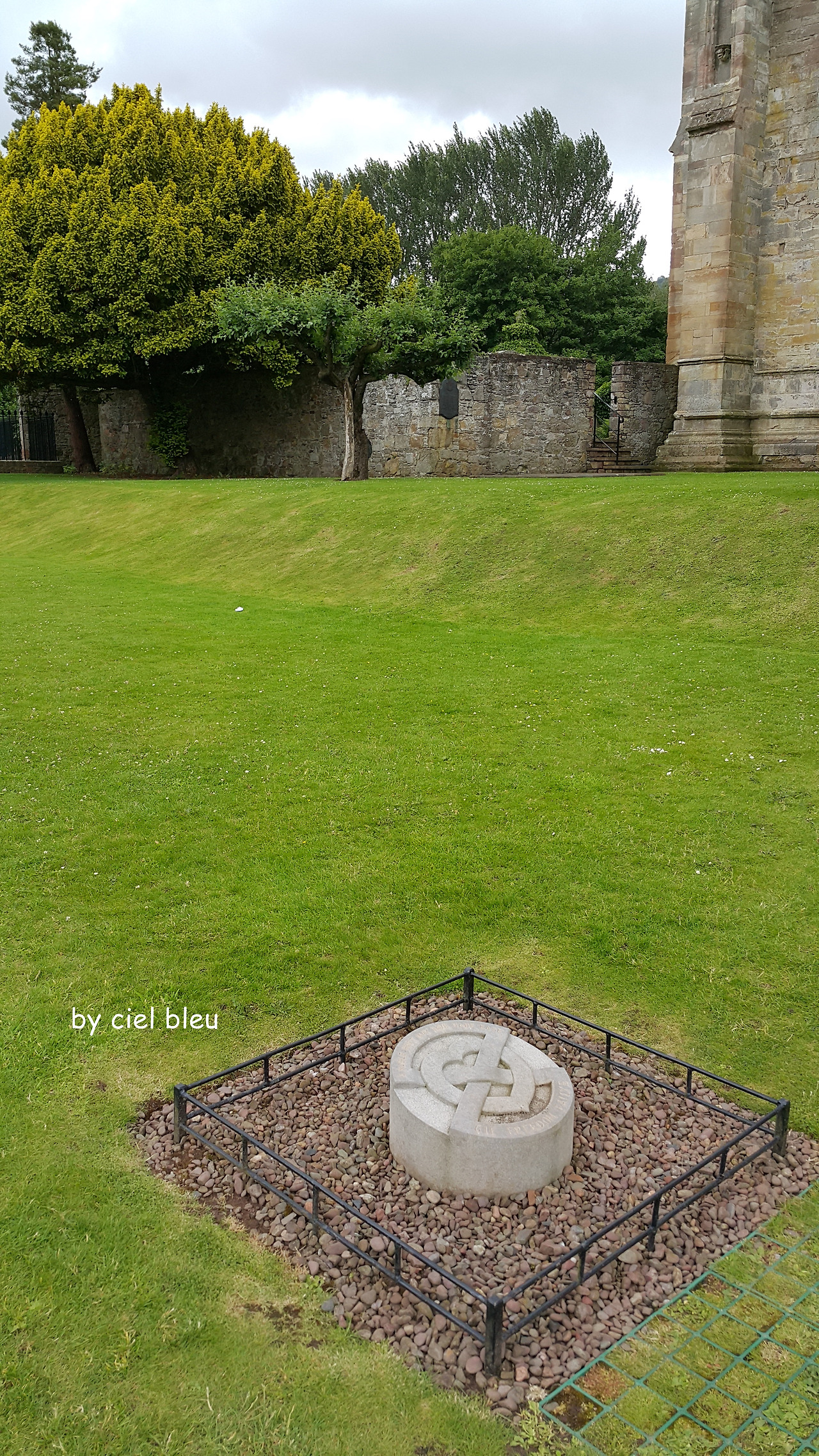 심장을 들고 있는 천사상과 로버트 부르스의 초상화 폐허가 된 멜로즈 성당과 부르스의 심장이 안치된 곳