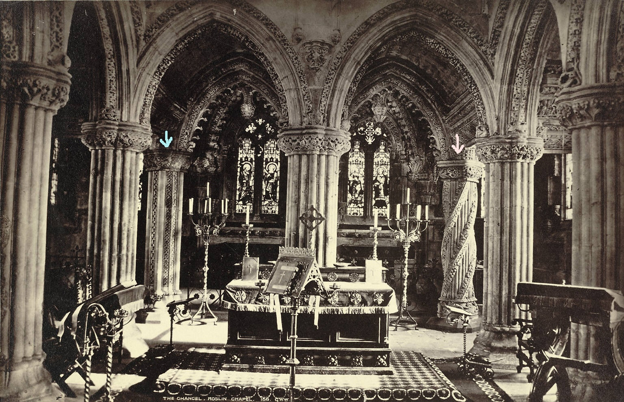 제단 뒤편 창문에는 생 클레어 가문의 문장인 십자가가 템플 기사단의 문장과 거의 같은 모습으로 스테인드 글라스를 장식하고 있다. 템플 기사단은 예루살렘의 솔로몬 성당(현재 Temple Mount지역으로 추정됨)을 지키고 관리하는 임무를 맡았었는데 당시 비밀스러운 일들이 진행되었다(성배를 가져갔다는 등)는 이야기가 회자되고 있는 기사단이다.